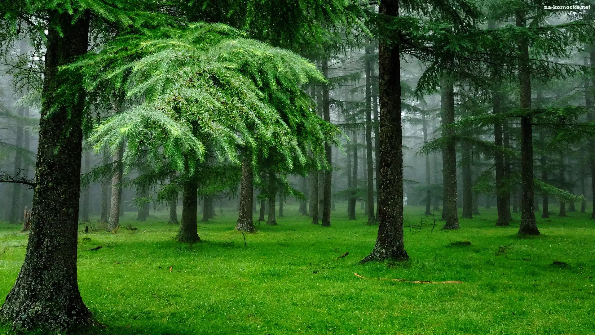 Mgła, Las iglasty, Drzewa, Ściółka, Polana na Komórkę