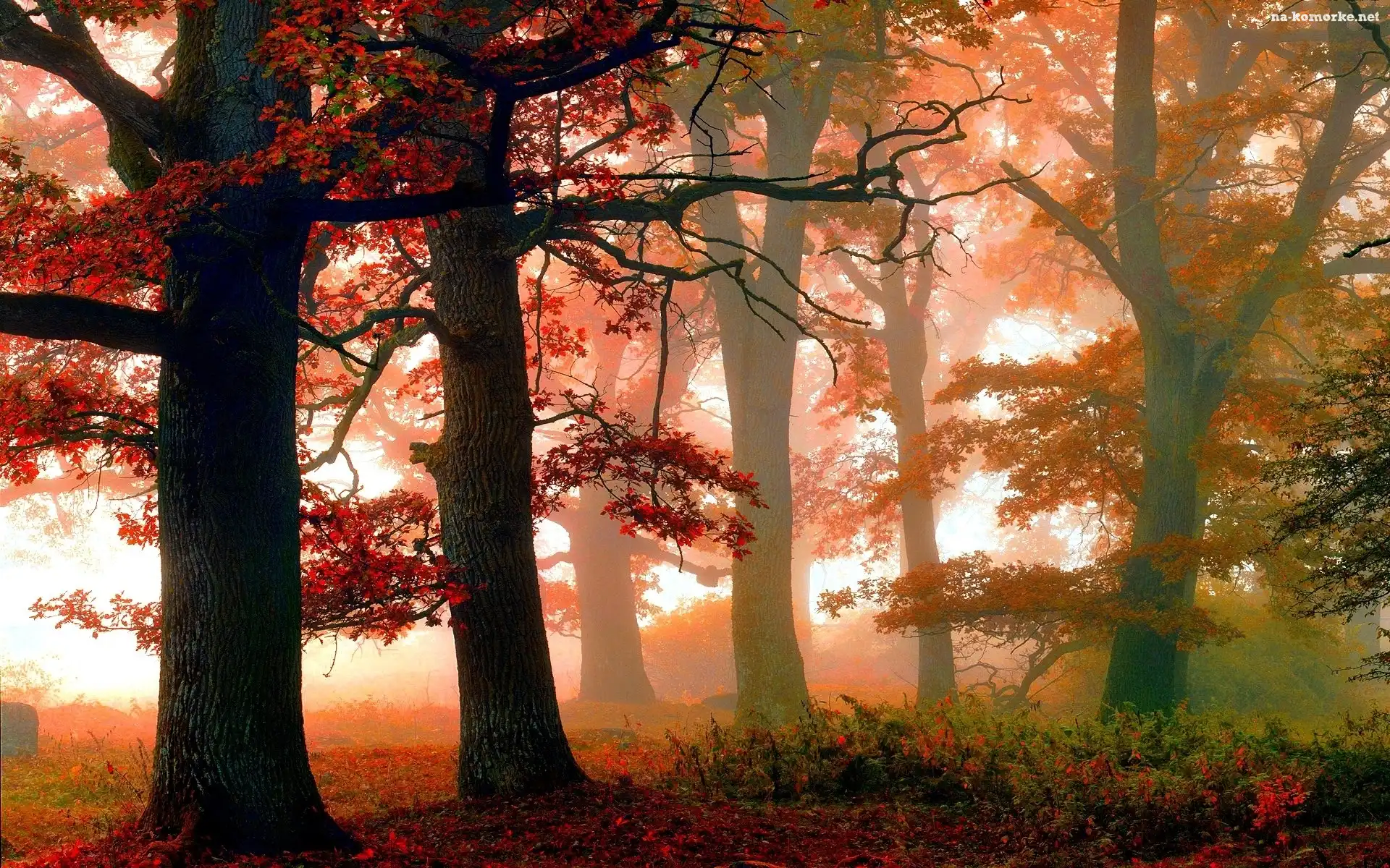 Mgła, Jesień, Drzewa, Czerwone, Liście na Komórkę