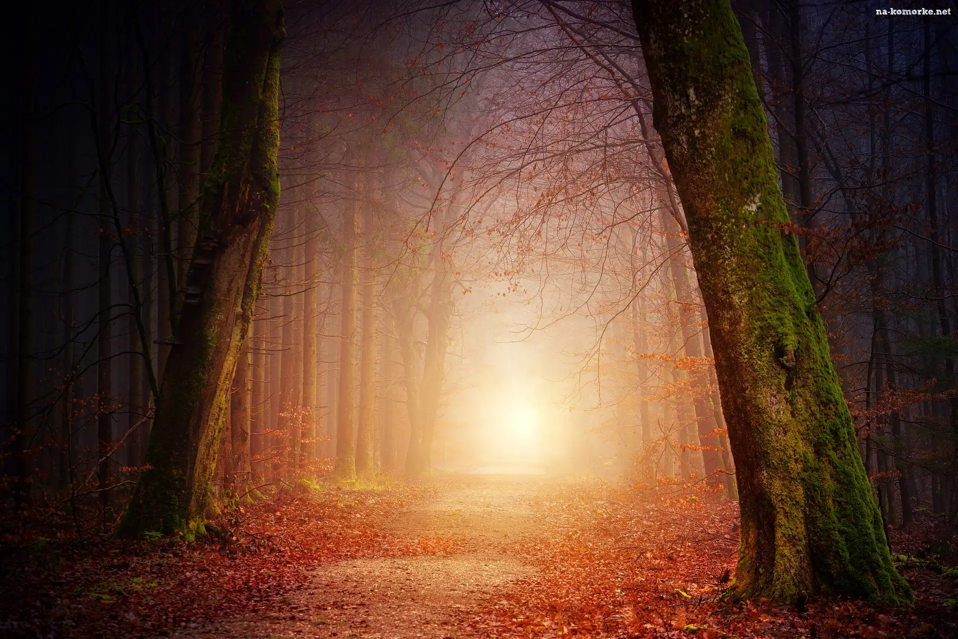Mgła, Drzewa, Las, Droga, Jesień na Komórkę