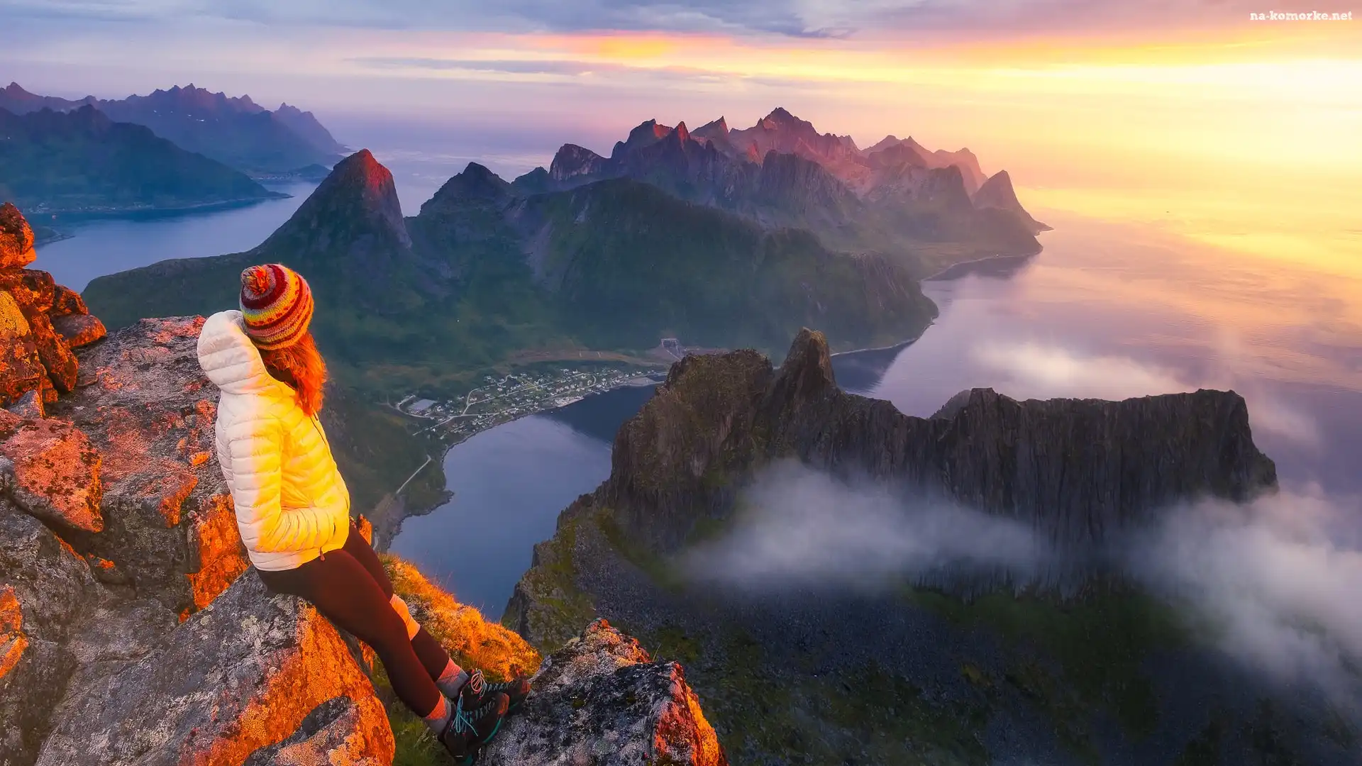 Mgła, Skały, Wyspa, Fiordy, Senja, Norwegia, Morze, Góry, Fjordgard, Kobieta na Komórkę