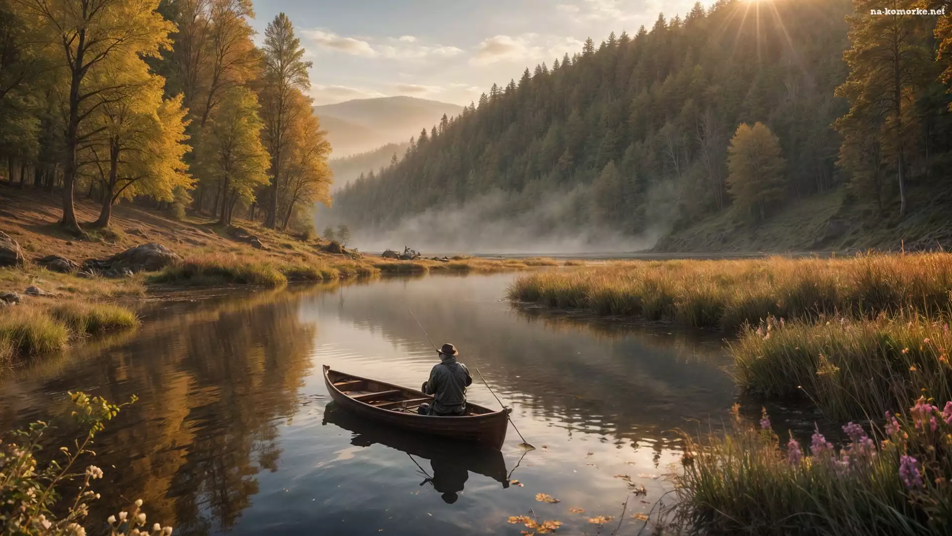 Jesień, Wędkarz, Drzewa, Mgła, Łódka, Jezioro na Komórkę