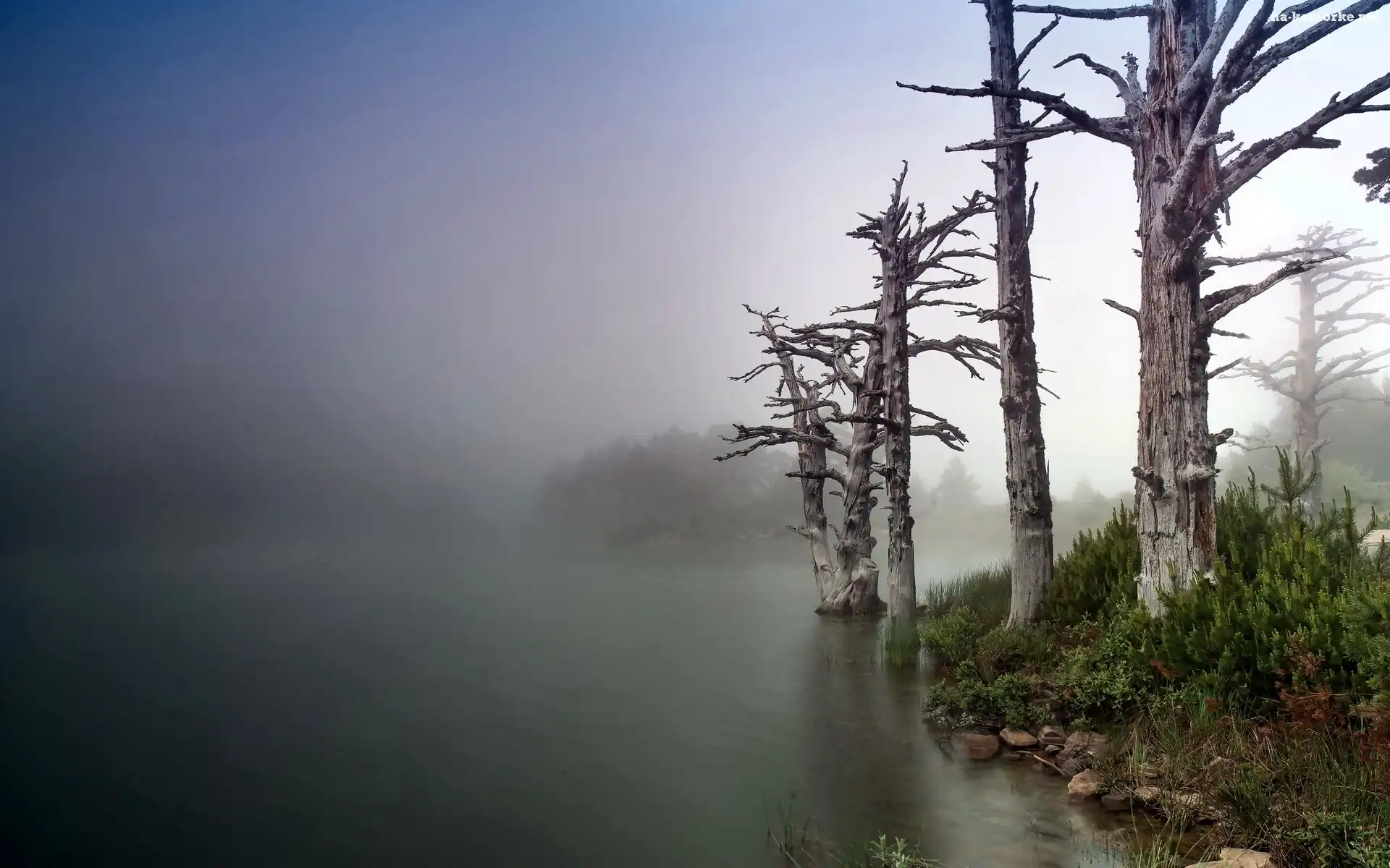 Mgła, Suche Drzewa, Jezioro, Brzeg na Komórkę