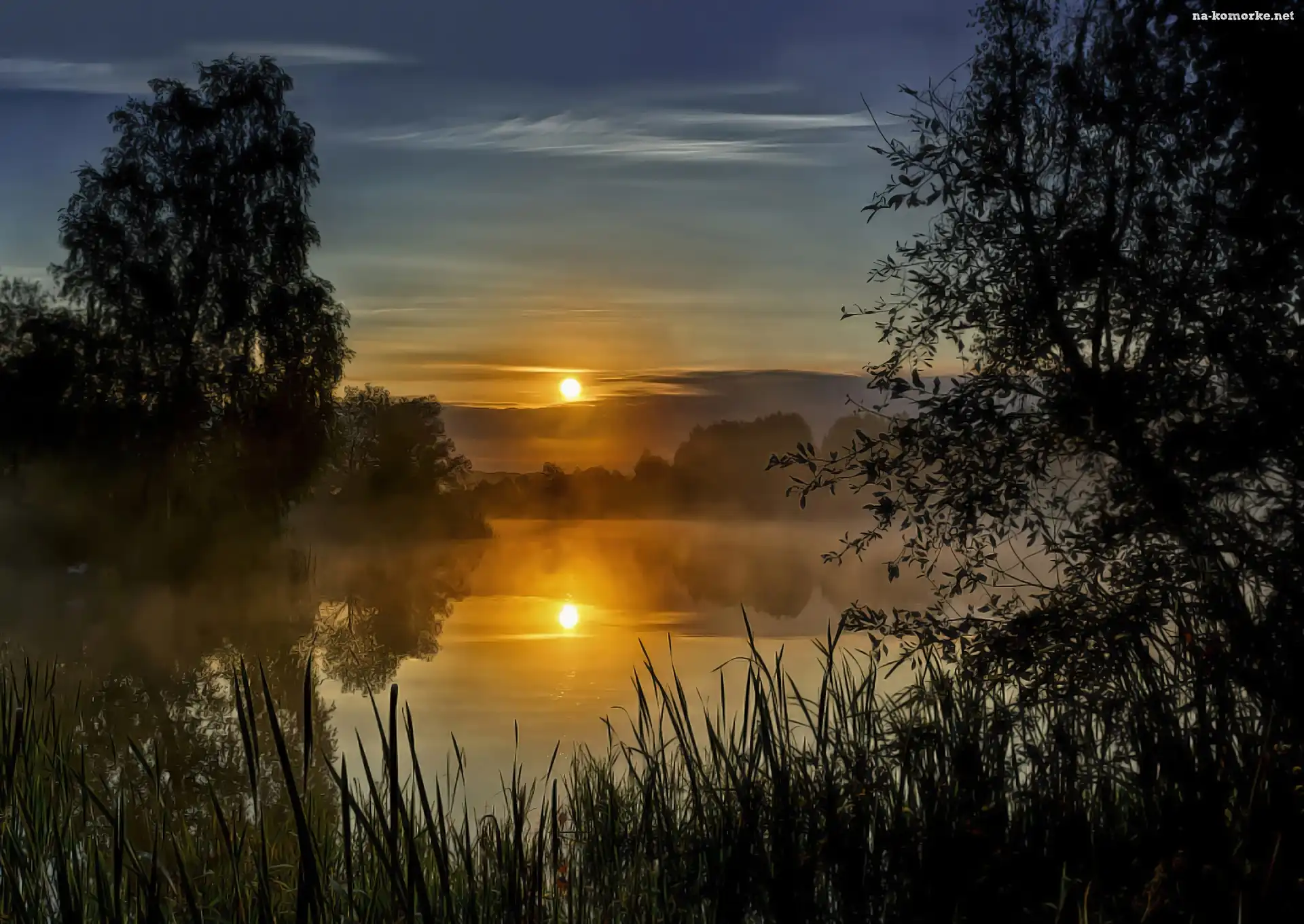 Mgła, Słońca, Zachód, Drzewa, Jezioro, Trawy na Komórkę