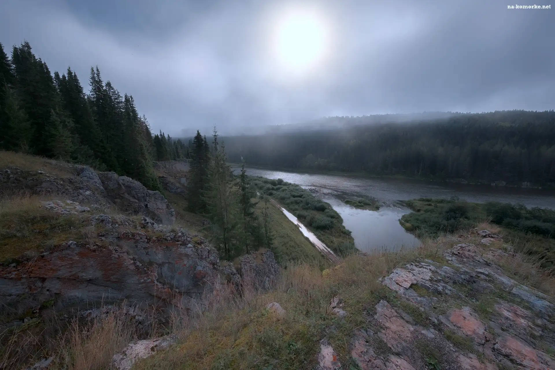 Rzeka Czusowaja, Kraj Permski, Rosja, Skały, Drzewa, Trawa, Mgła na Komórkę