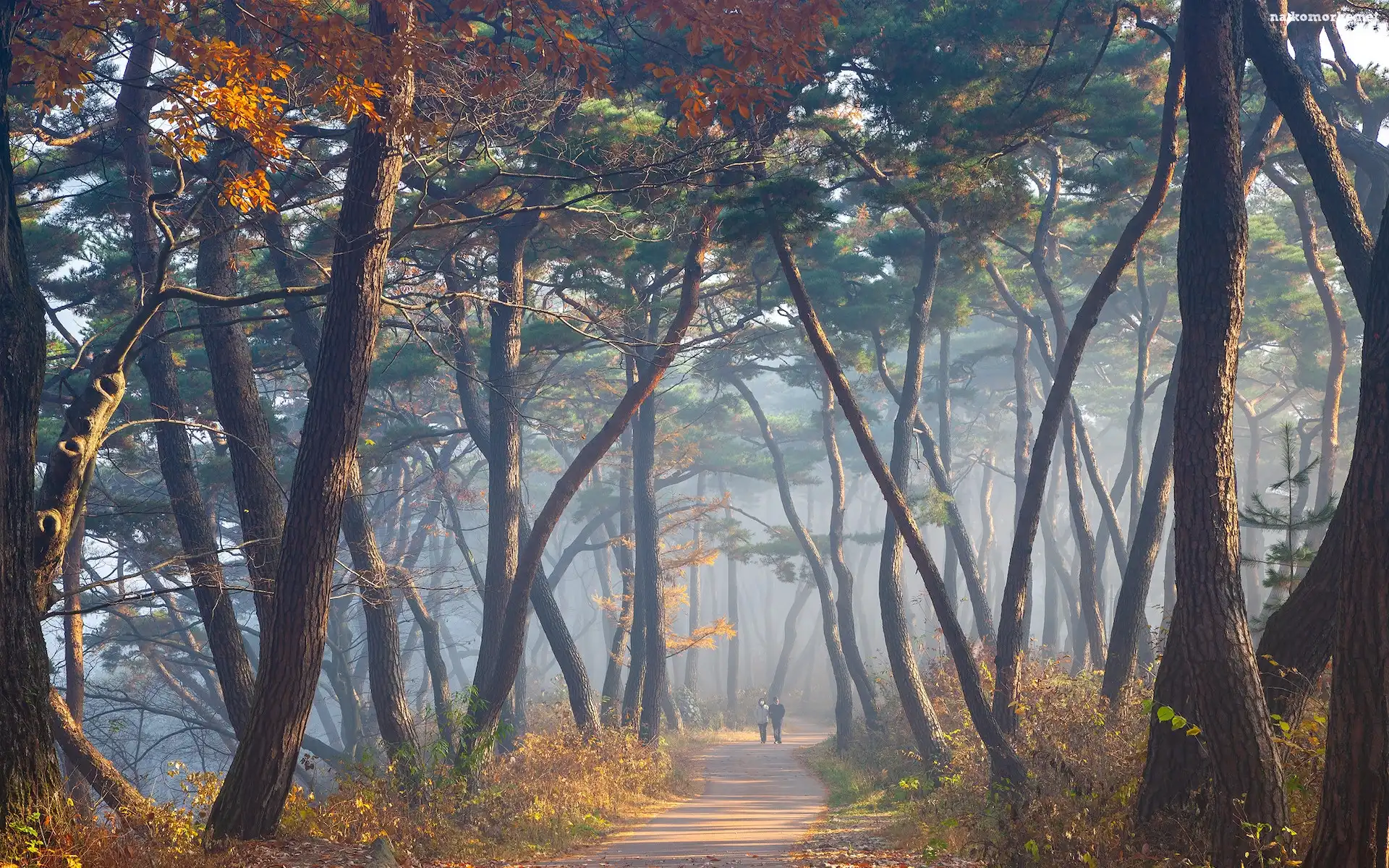 Las, Mgła, Ludzie, Drzewa, Sosny, Jesień, Droga na Komórkę