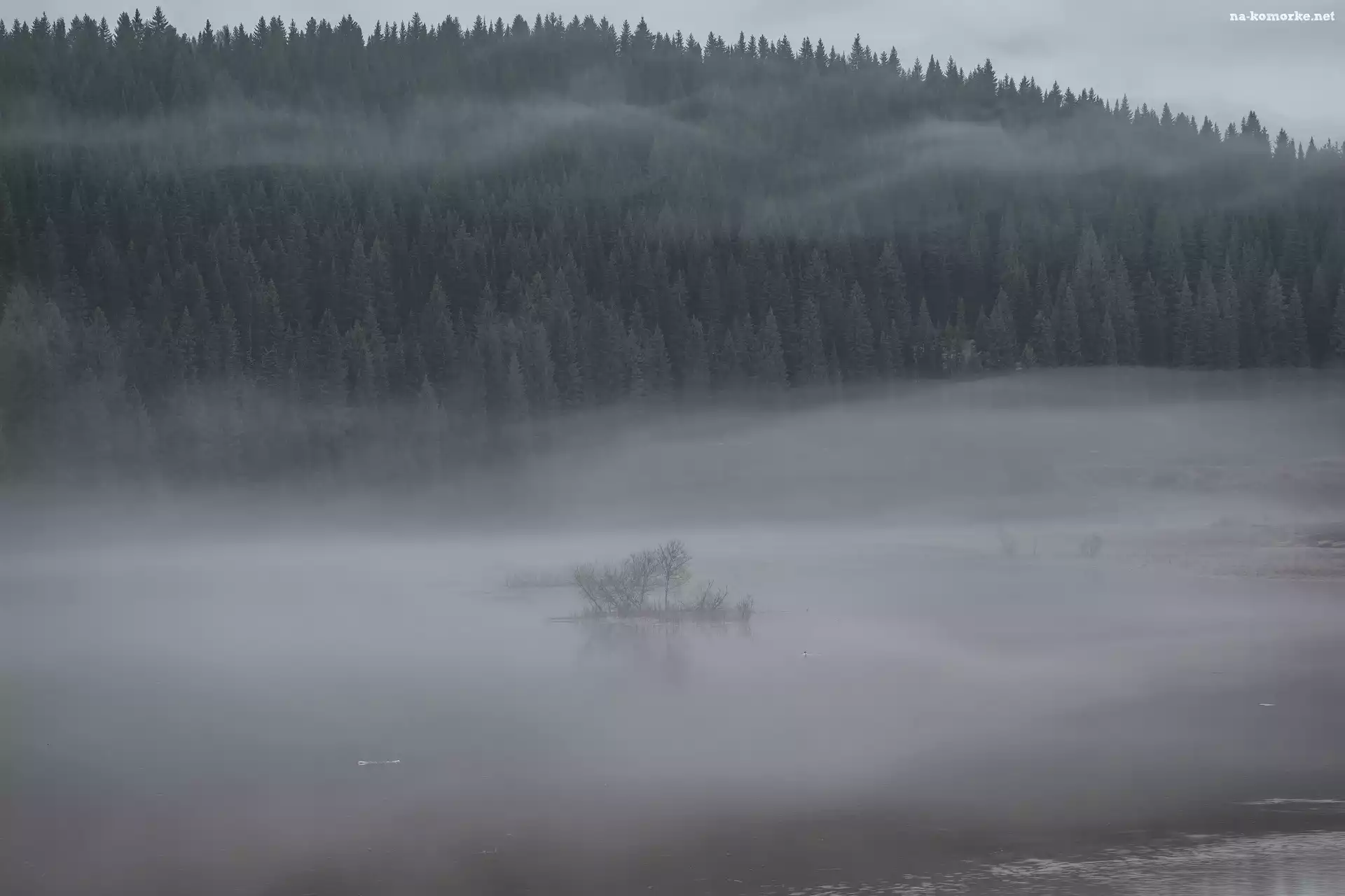 Mgła, Drzewa, Las, Rzeka na Komórkę