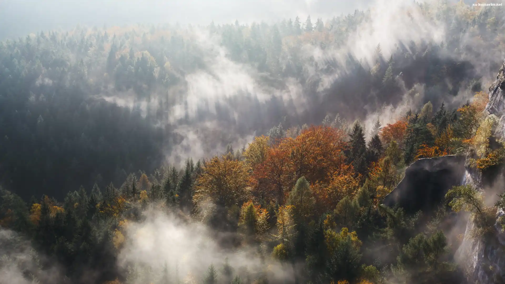 Mgła, Jesień, Góry, Las, Drzewa na Komórkę