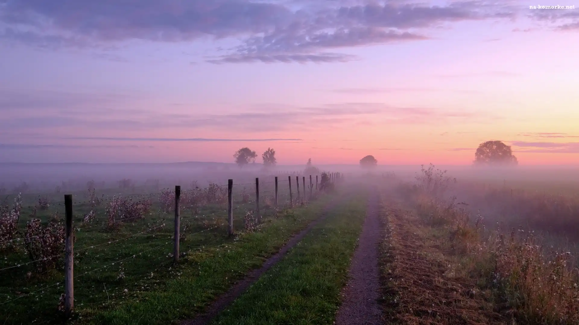 Ogrodzenie, Mgła, Wschód słońca, Drzewa, Droga, Łąki na Komórkę