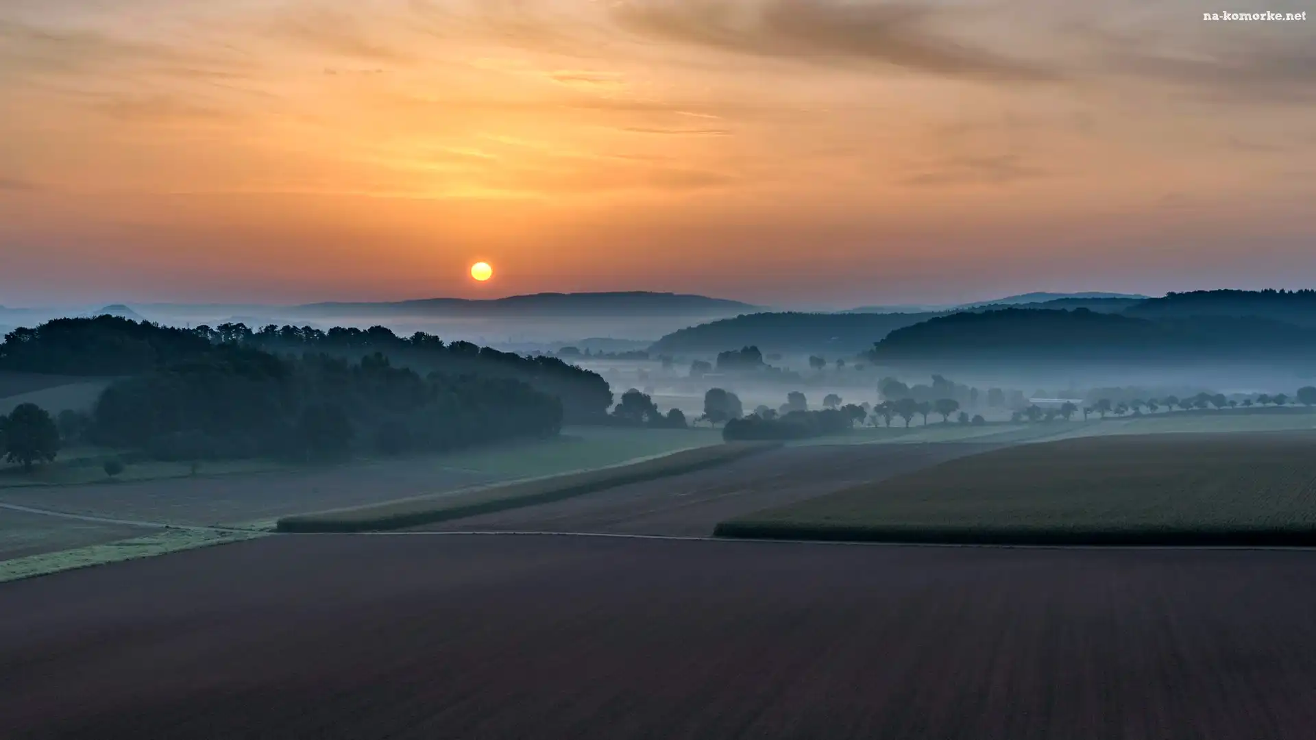 Wschód słońca, Pola, Mgła, Góry, Drzewa, Dolina na Komórkę