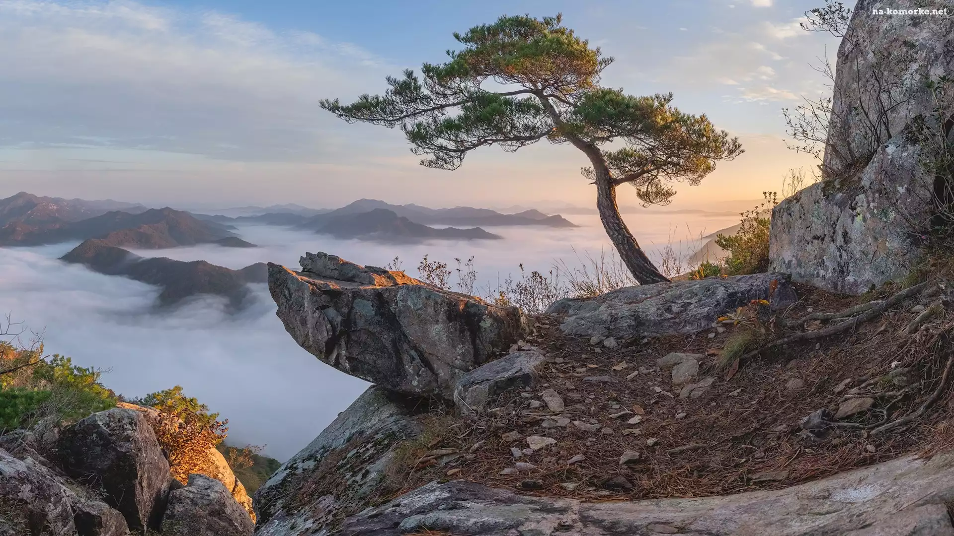 Góry, Mgła, Sosna, Skały, Pochylona na Komórkę