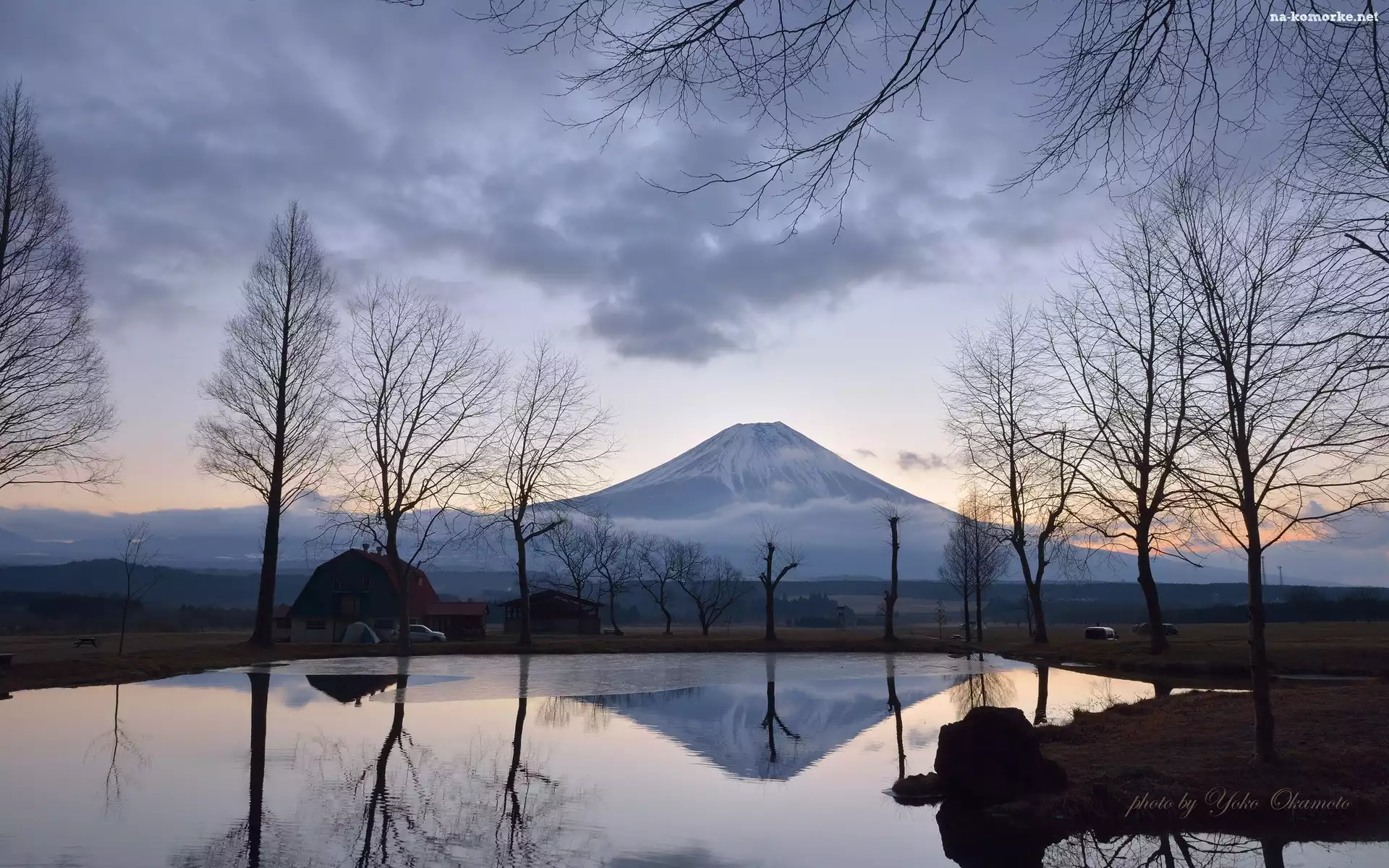 Staw, Mgła, Japonia, Domy, Drzewa, Chmury, Fudżi na Komórkę