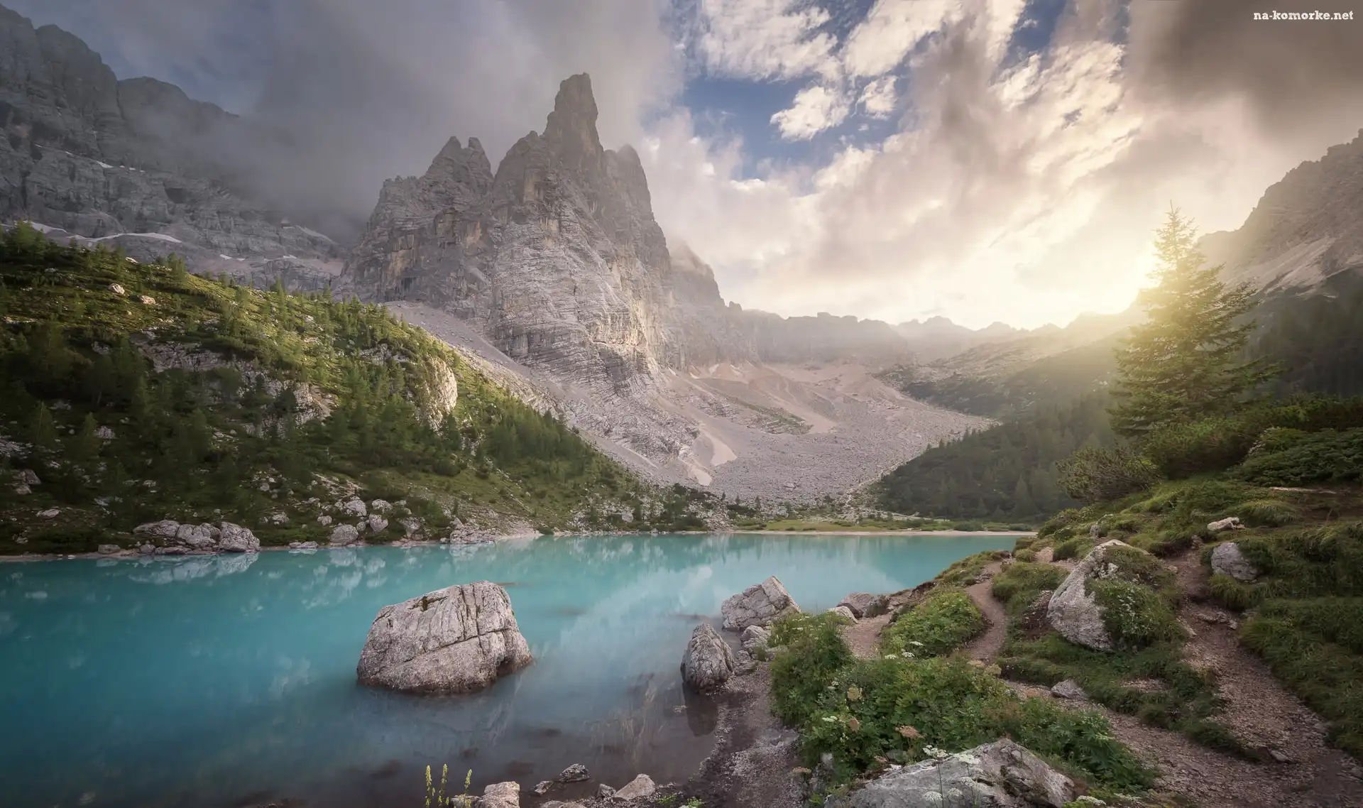 Góry, Kamienie, Włochy, Dolomity, Masyw Sorapiss, Jezioro Sorapis, Mgła na Komórkę