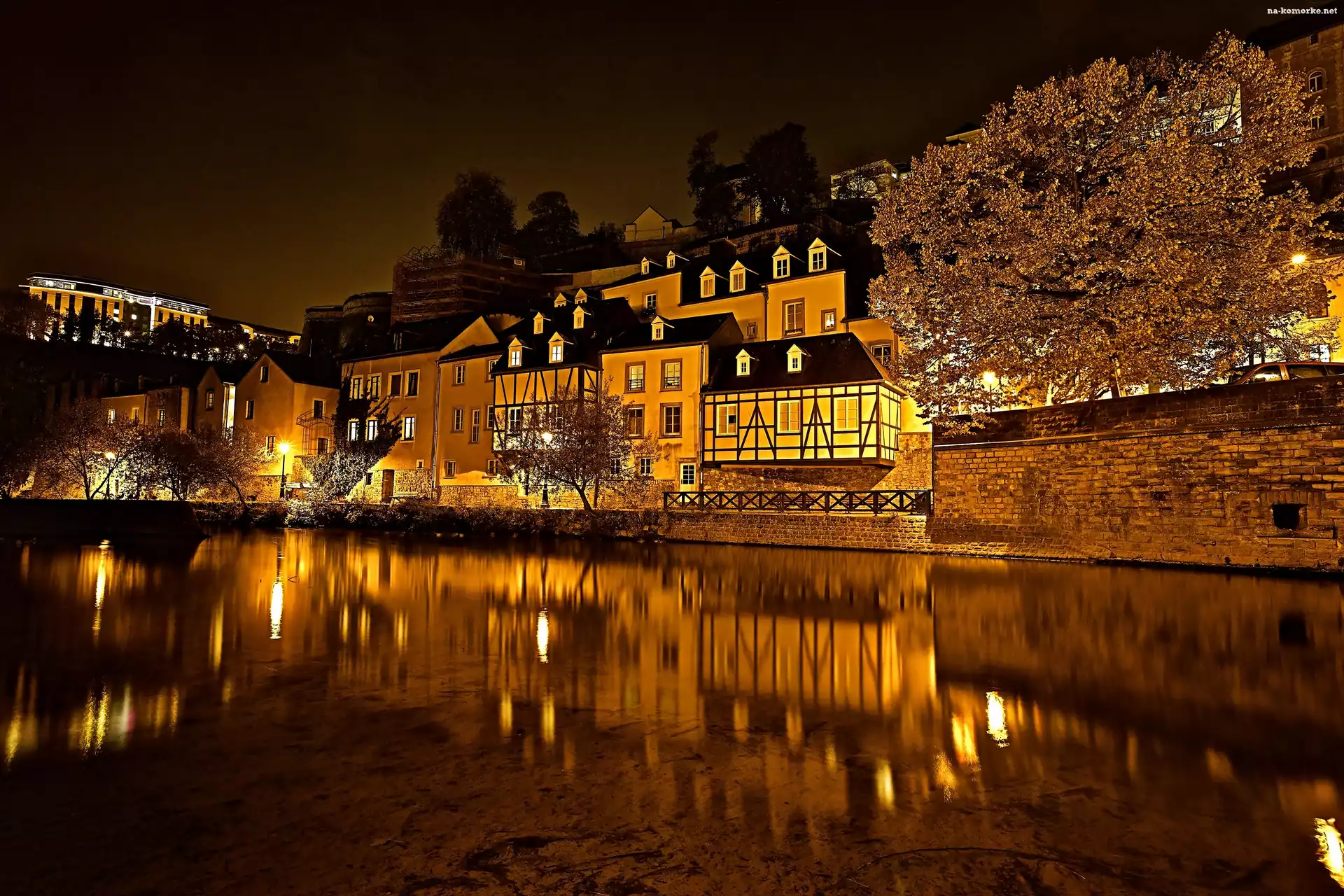 Domy, Miasta, Nocą, Rzeka, Petrusse, Luksemburg, Fragment na Komórkę