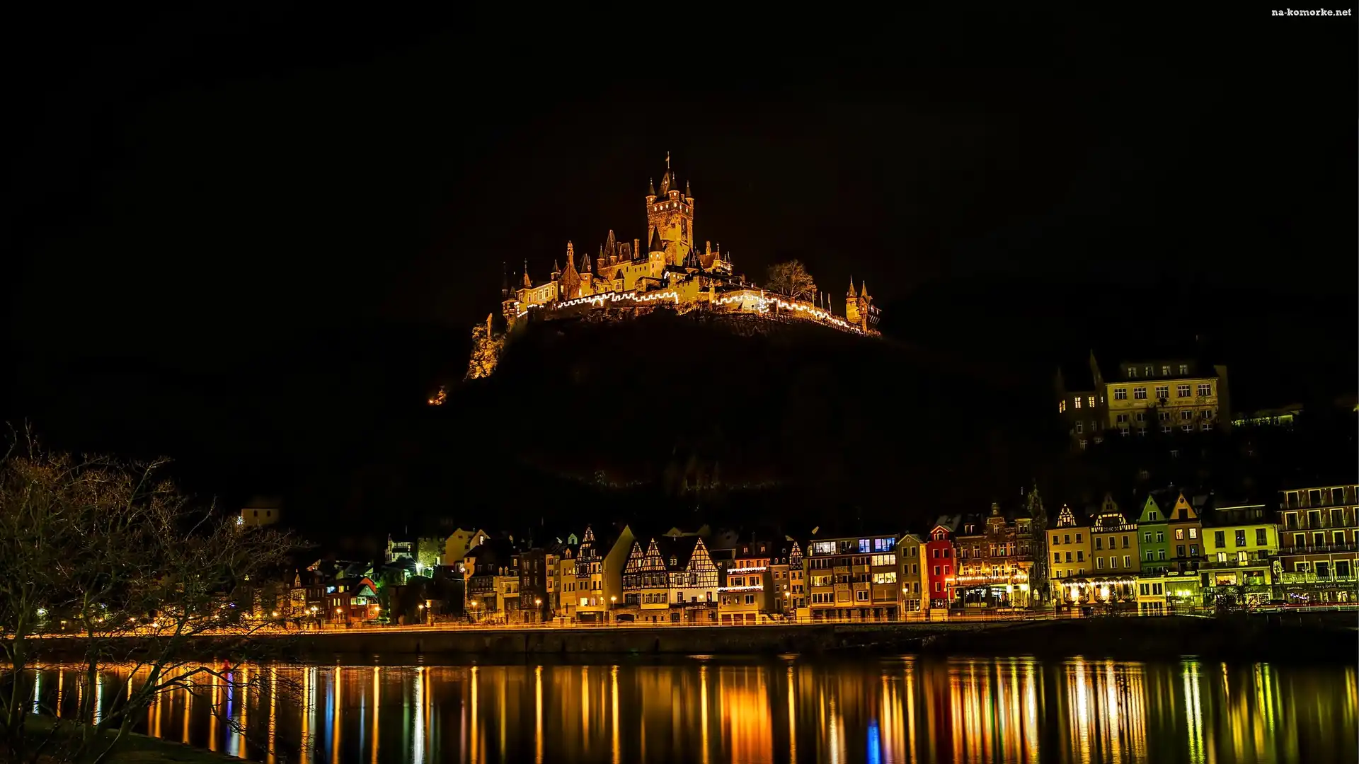 Miasto, Reichsburg, Zamek, Nocą, Rzeka, Cochem na Komórkę
