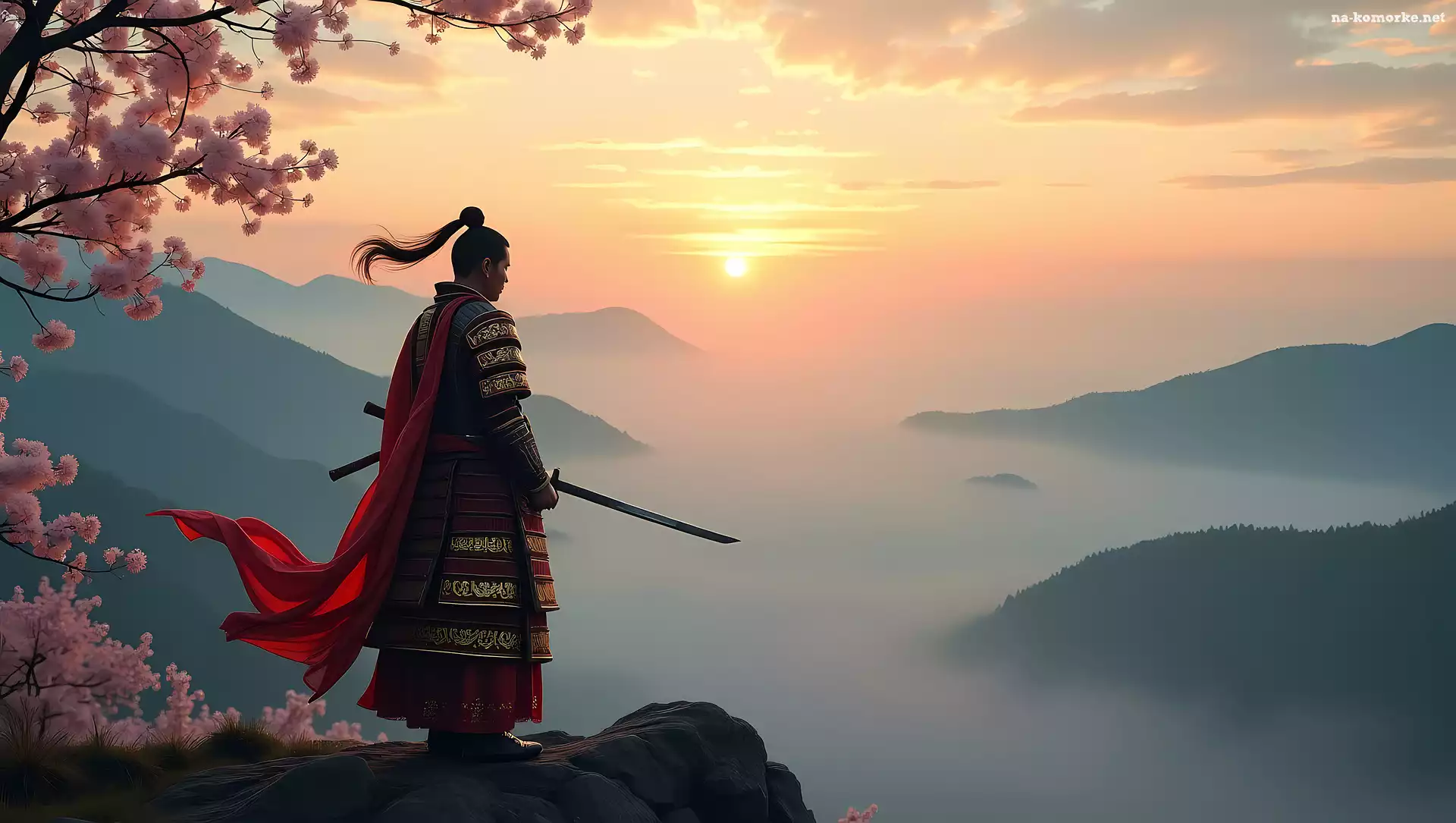 Góry, Mgła, Wojownik, Zachód słońca, Skała, Drzewo, Miecz na Komórkę