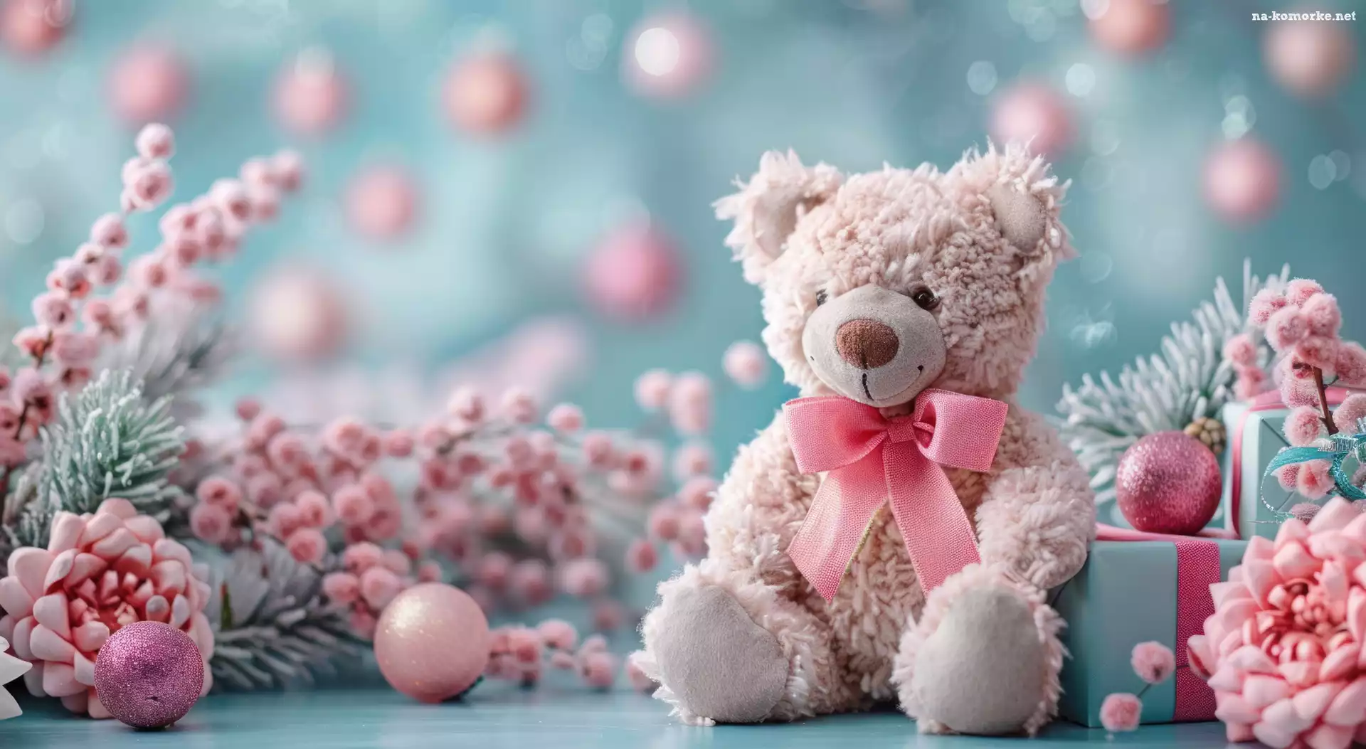 Różowa, Kwiaty, Prezent, Zabawka, Bombki, Gałązki, Kokarda, Miś na Komórkę