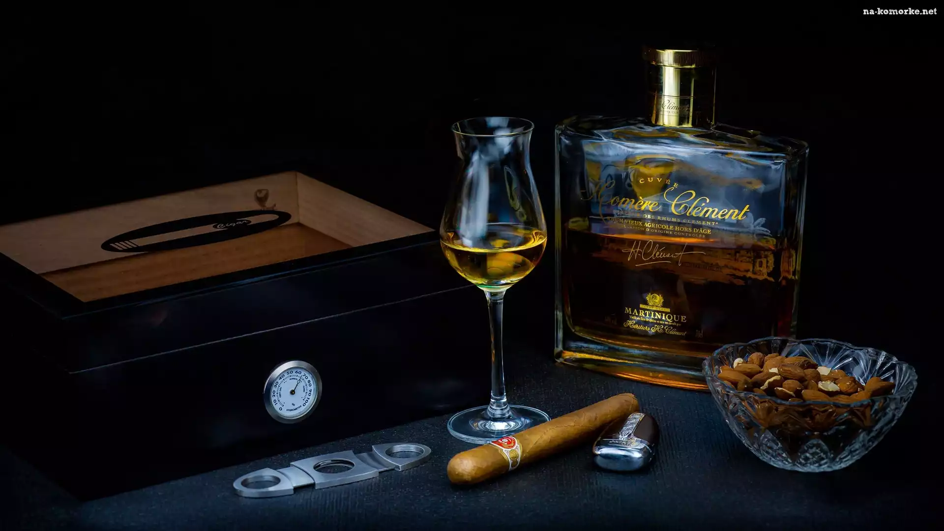 Rum, Kompozycja, Cygaro, Homere Clement, Kasetka, Butelka, Migdały, Kieliszek, Miseczka na Komórkę |