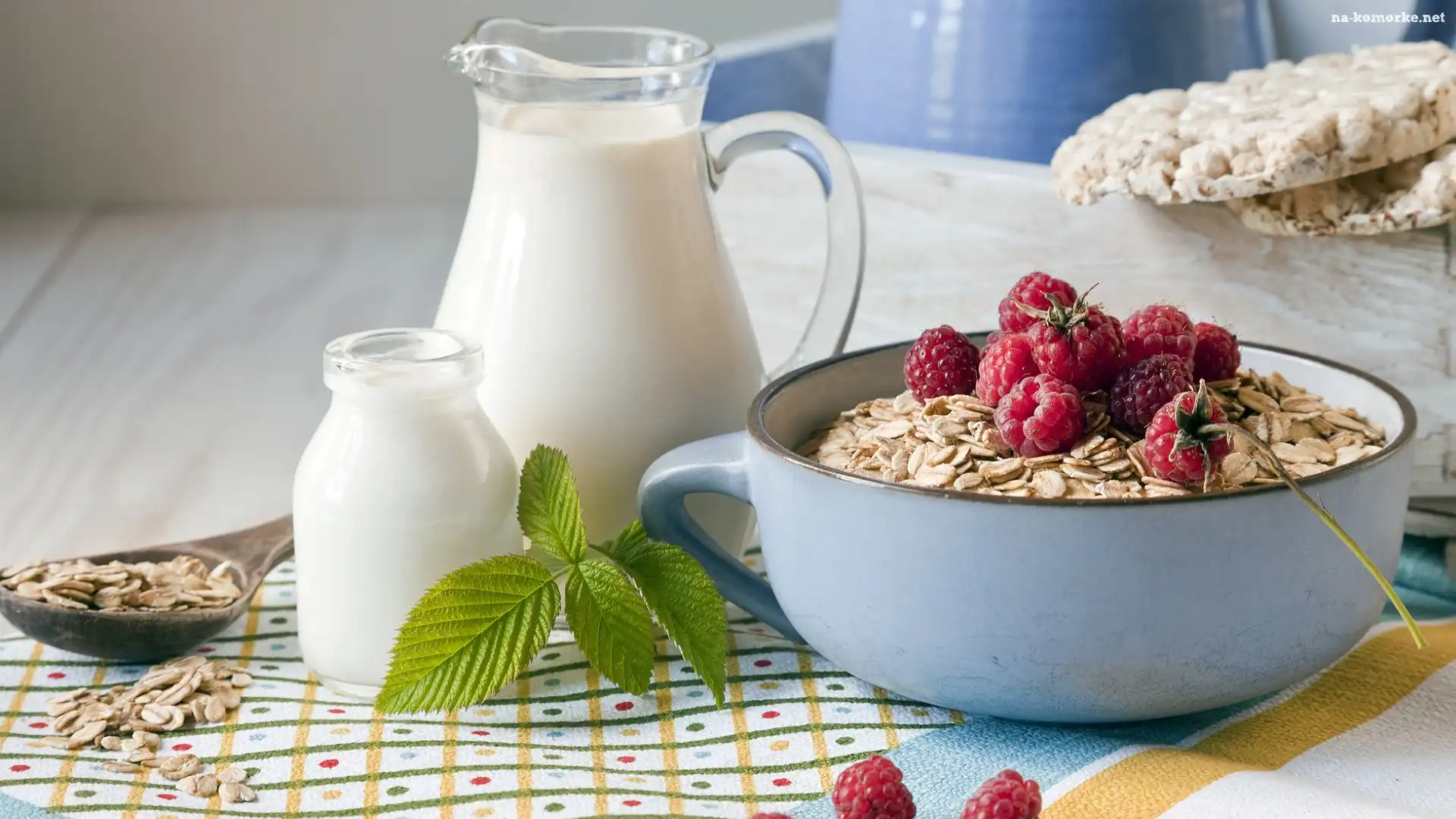 Miseczka, Butelka, Dzbanek, Maliny, Mleko, Płatki na Komórkę