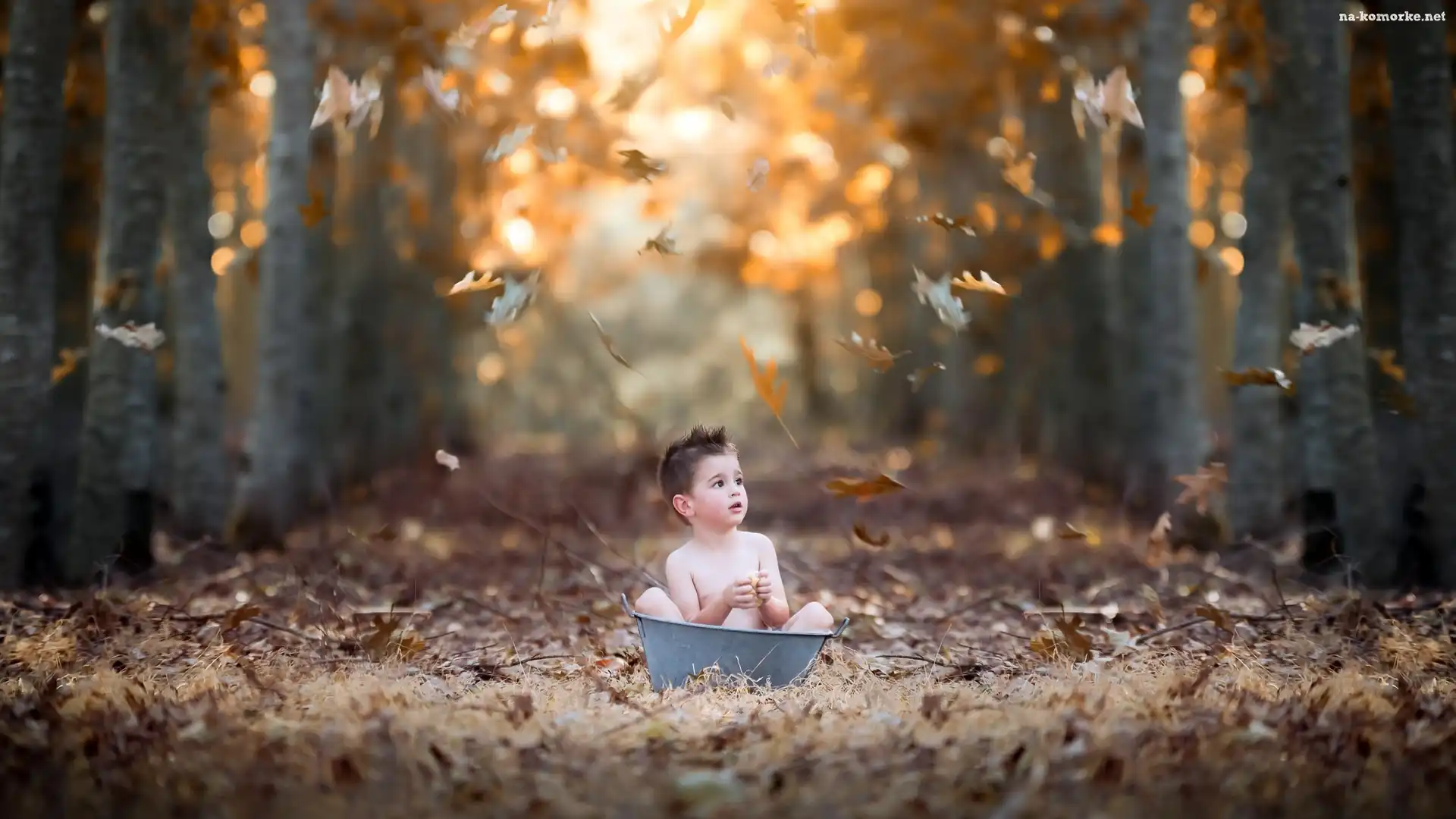 Alejka, Miska, Dziecko, Drzewa, Metalowa balia, Liście na Komórkę