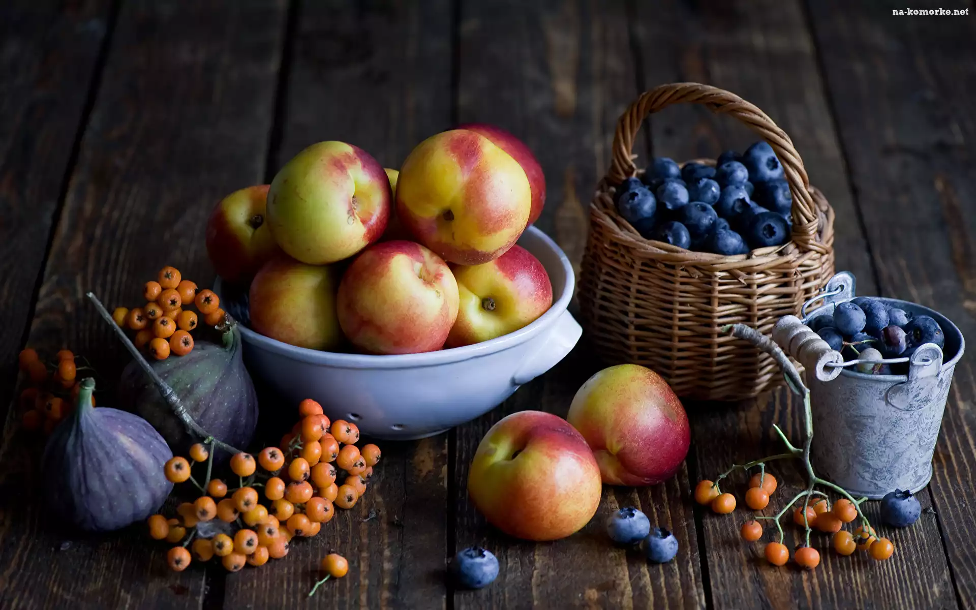 Owoce, Figi, Deski, Borówki, Koszyk, Wiaderko, Jabłka, Rośliny, Jarzębina, Miska na Komórkę