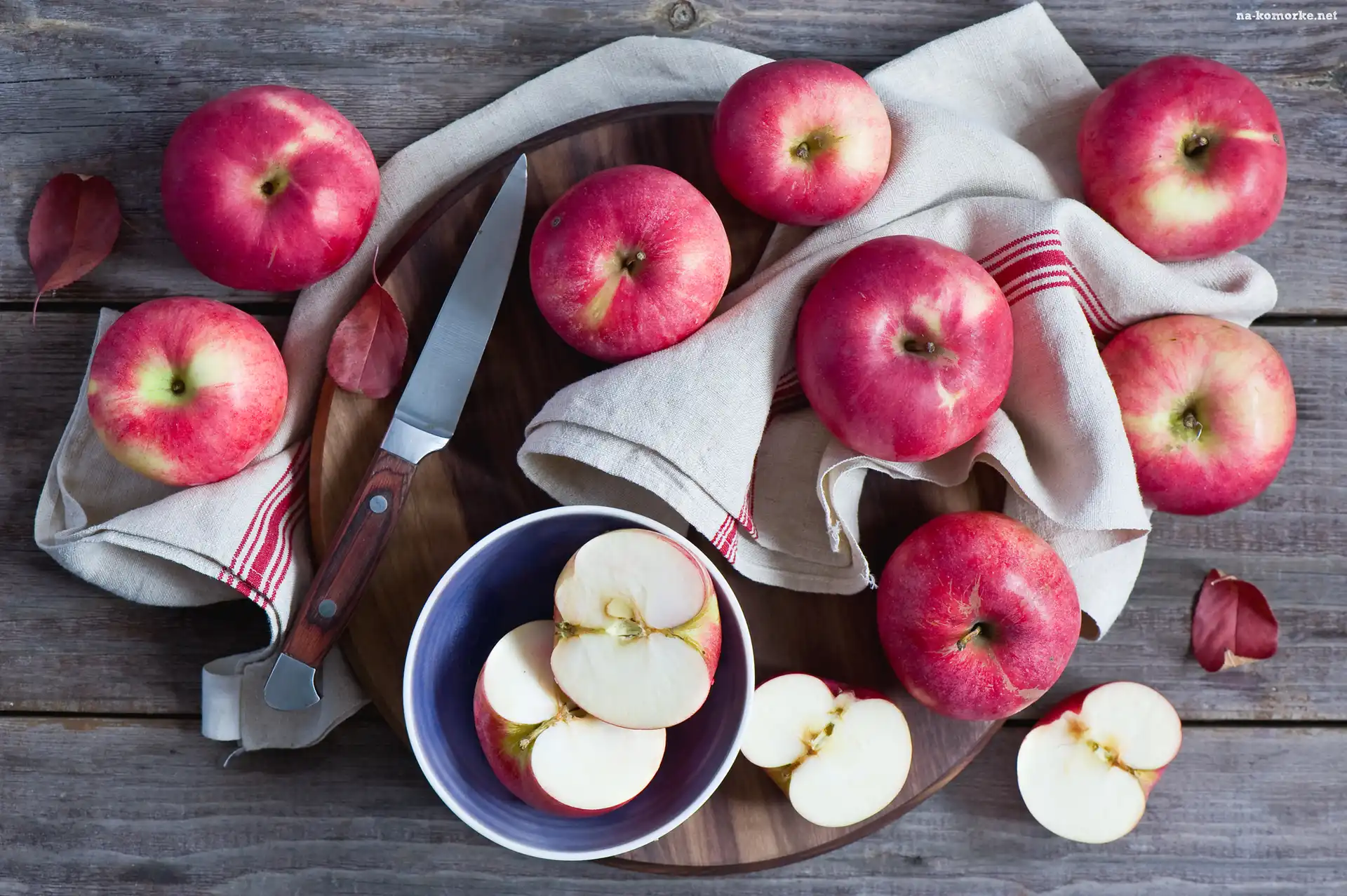 Miska, Deska, Jabłka, Tkanina, Nóż, Listki na Komórkę