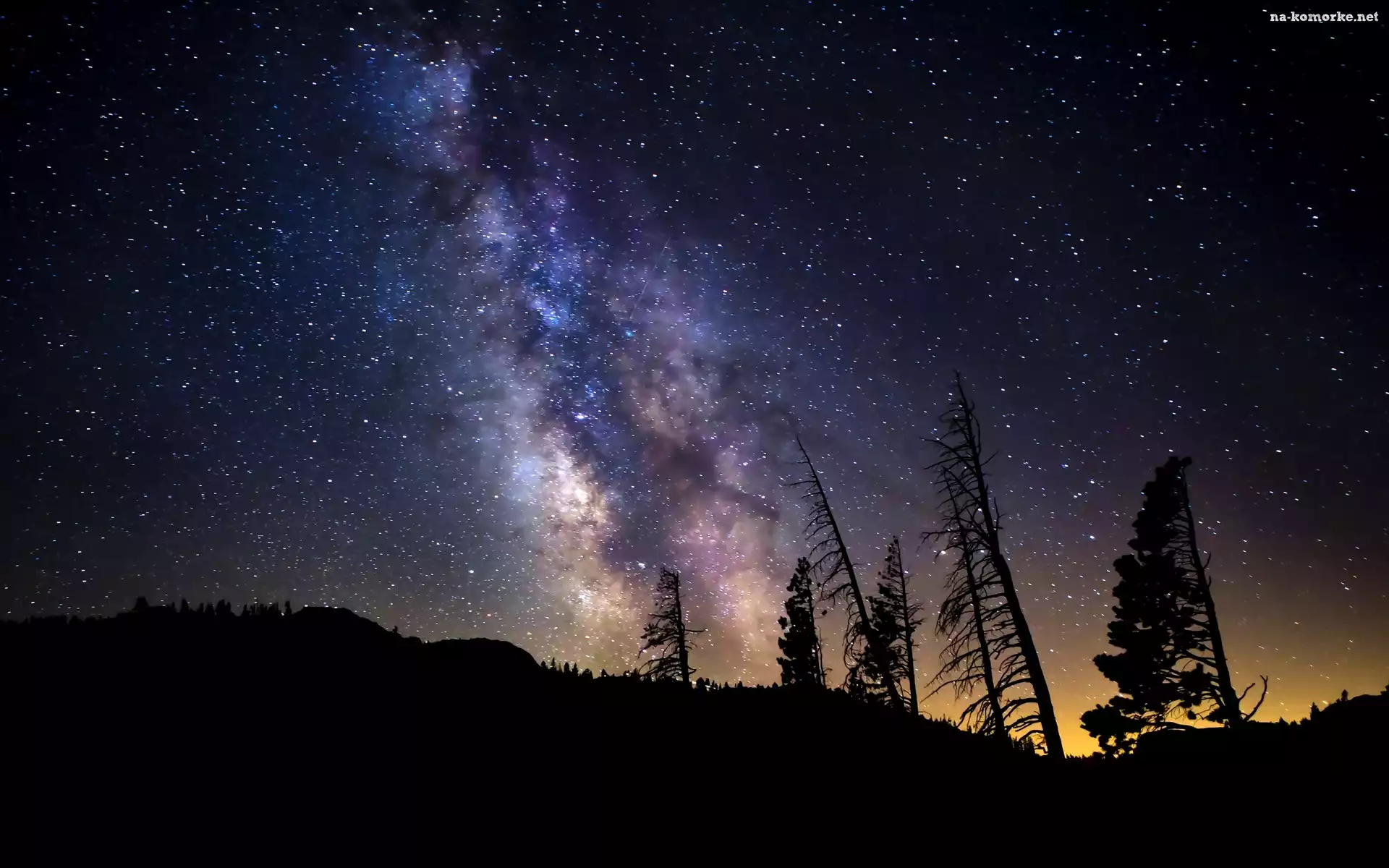 Mleczna, Niebo, Noc, Drzewa, Gwiazdy, Droga na Komórkę