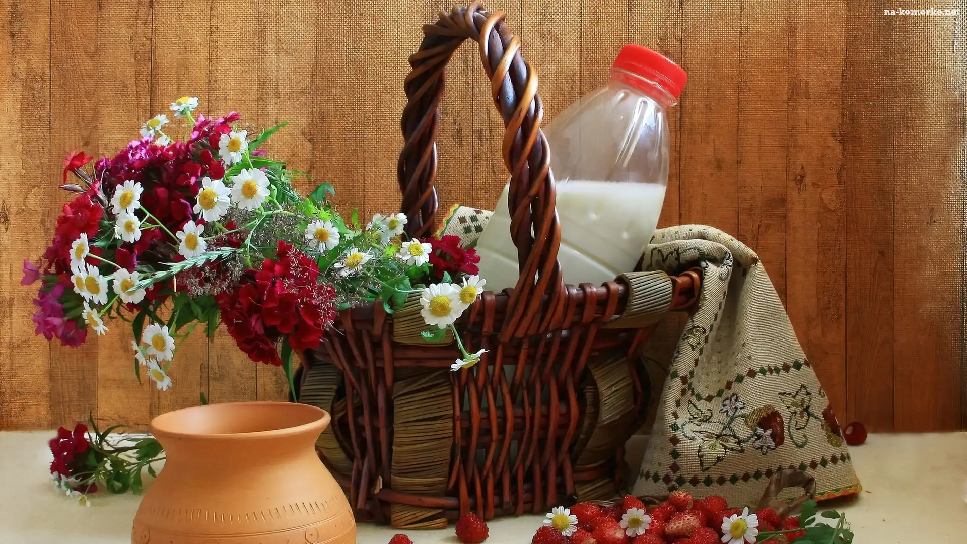 Mleko, Bukiet, Kwiatów, Kosz, Poziomki na Komórkę