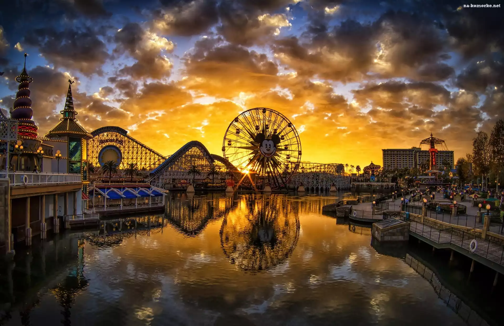 Stany Zjednoczone, Rzeka, Zachód słońca, Kalifornia, Anaheim, Disneyland, Diabelski młyn na Komórkę