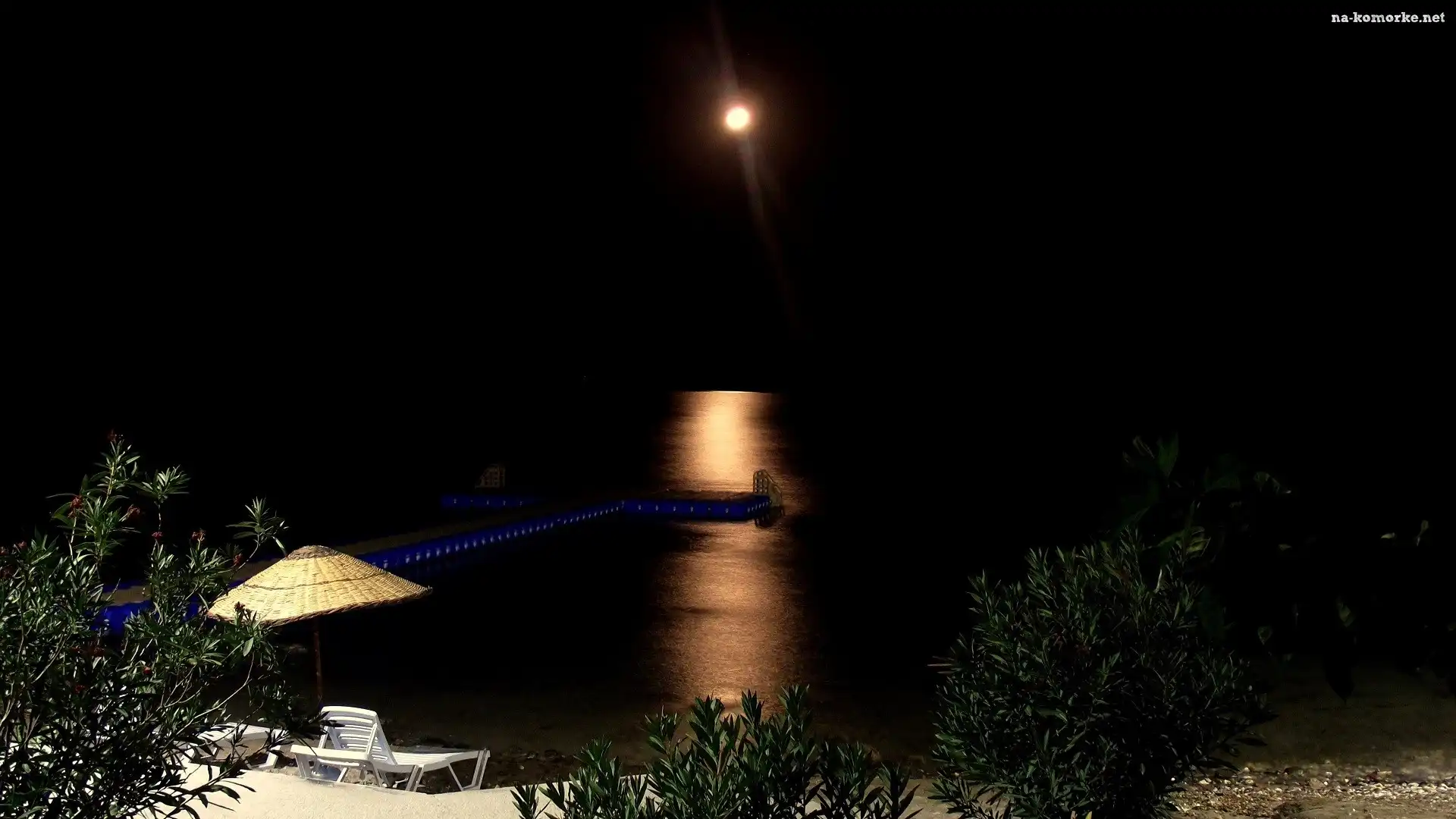 Molo, Księżyc, Jezioro, Krzewy, Noc, Leżaki na Komórkę