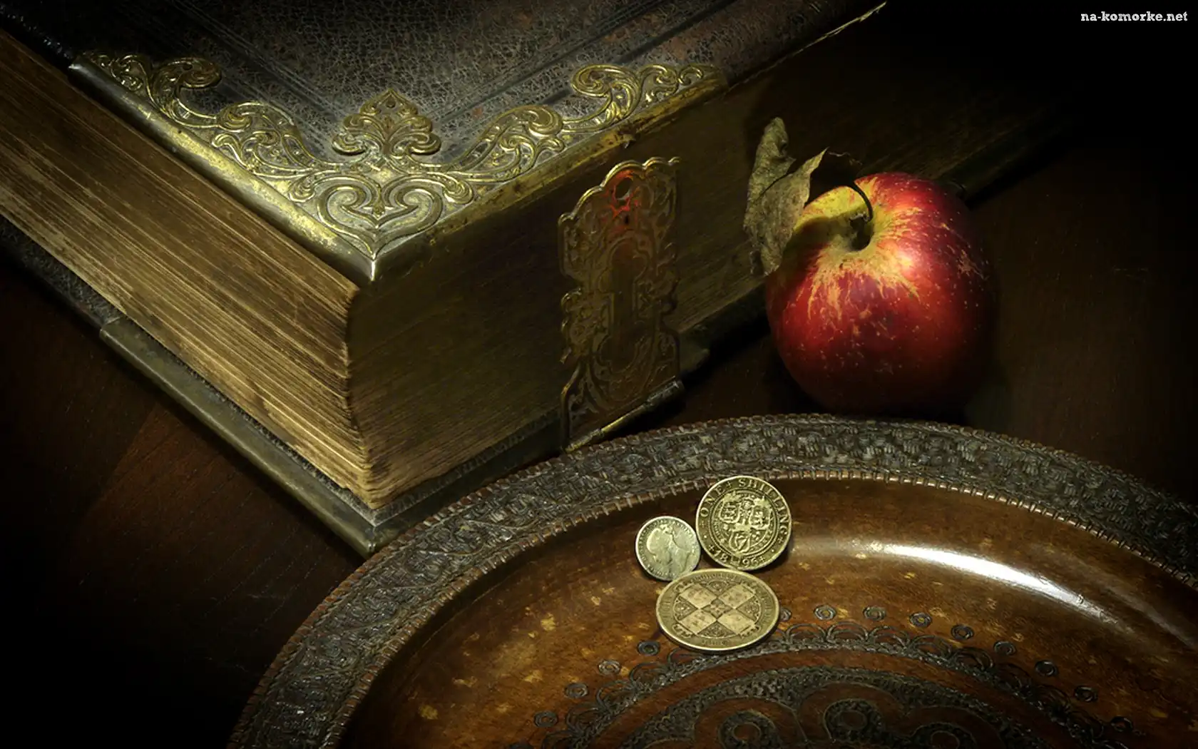 Monety, Czerwone, Jabłko, Stara, Książka na Komórkę