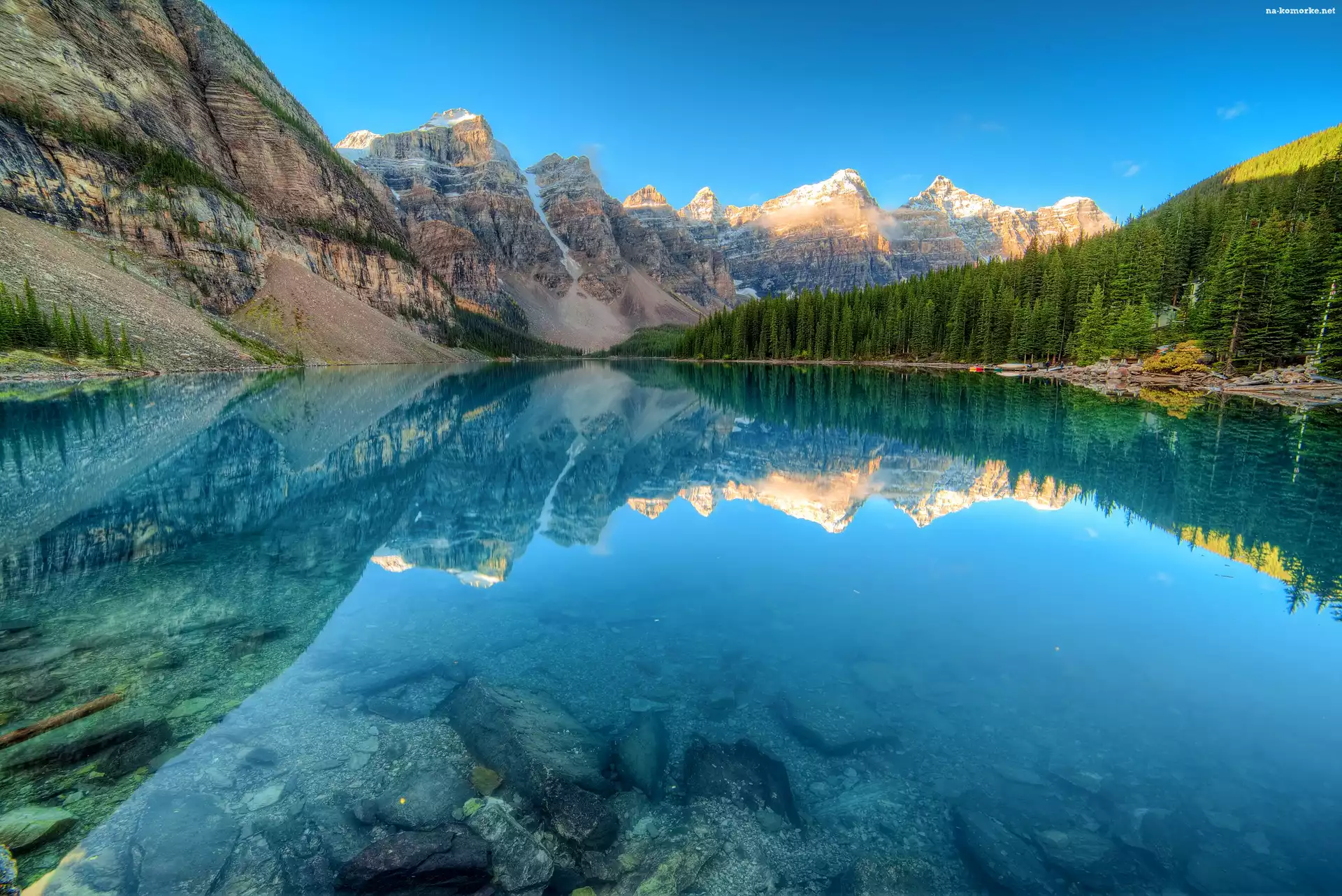 Jezioro Moraine, Kanada, Park Narodowy Banff, Góry, Lasy na Komórkę