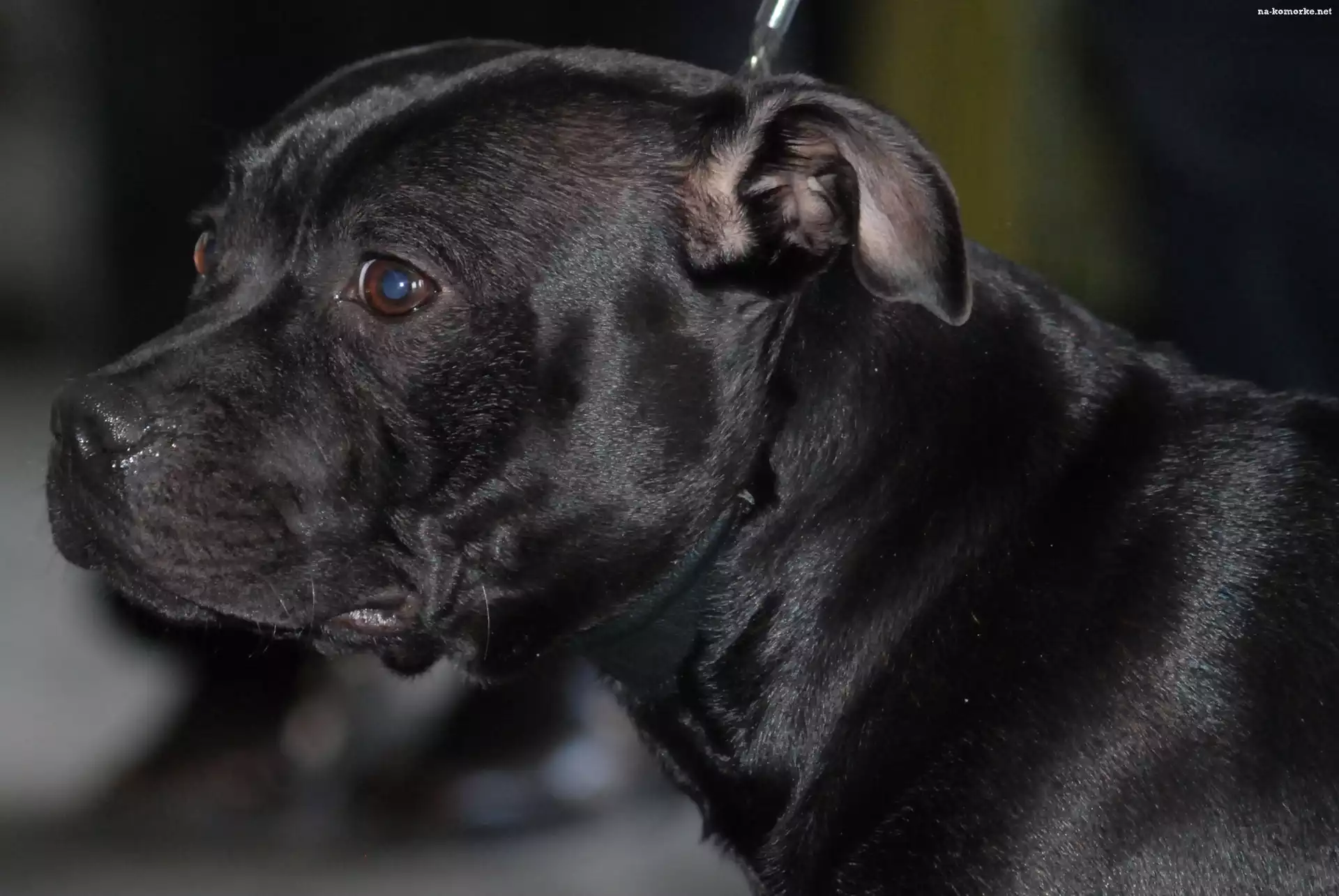 Staffordshire Bull Terrier, obroża Pies, Wrzosy, Staffordshire Bull Terrier, Mordka Pies, Trawa, Staffordshire Bull terrier morda, Staffordshire Bull Terrier