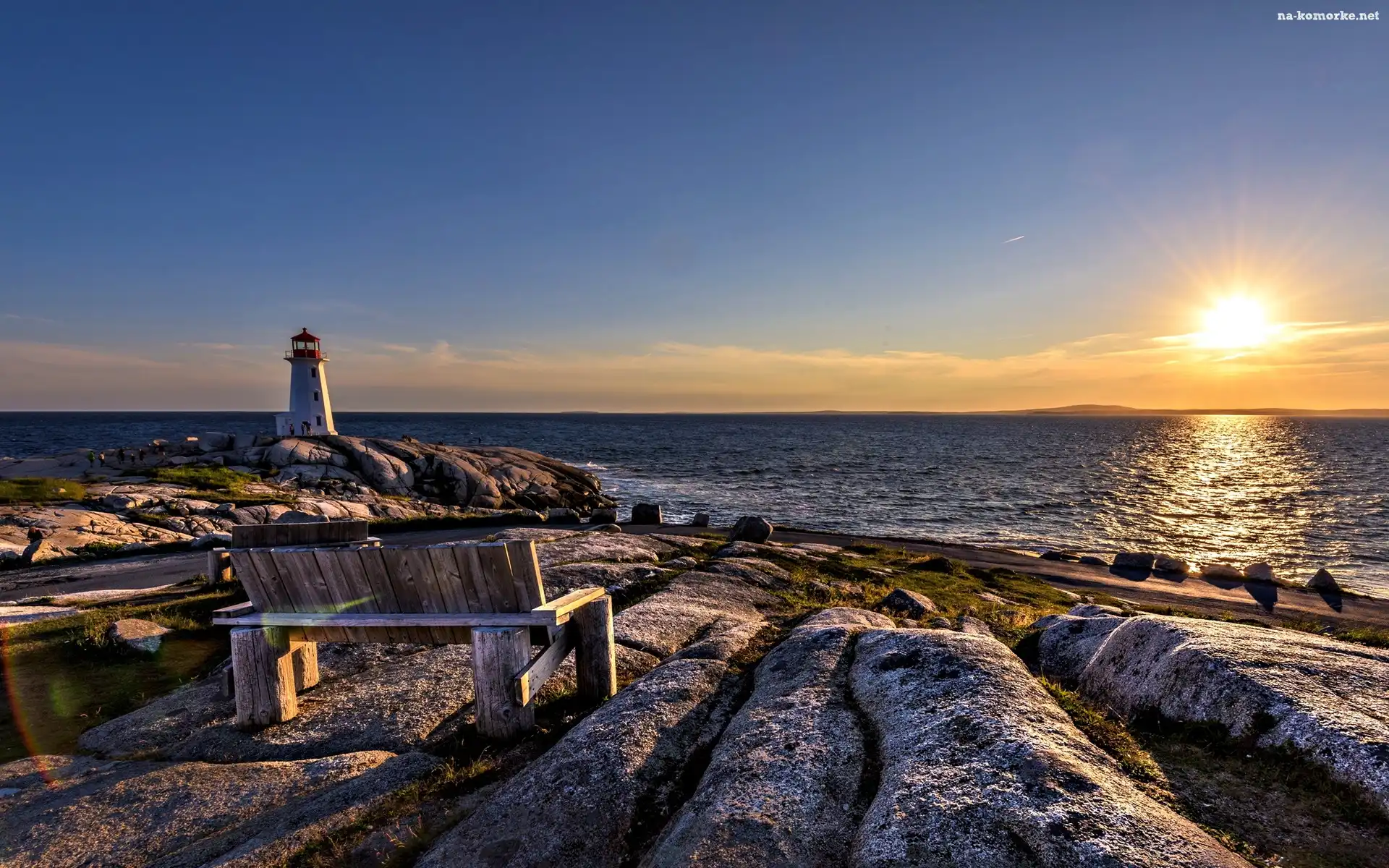 Latarnia Morska, Zachód Słońca, Morze, Skałki, Ławka na Komórkę