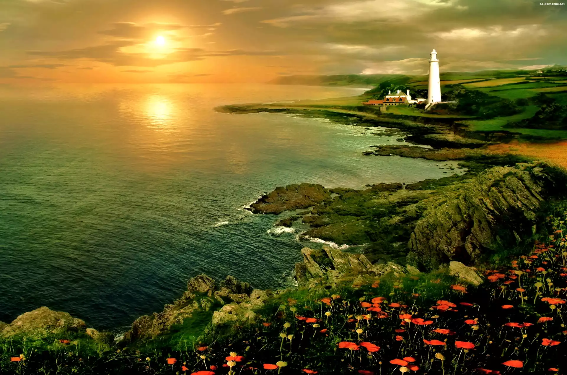 Morska, Słońca, Zachód, Kwiaty, Latarnia, Wybrzeże na Komórkę