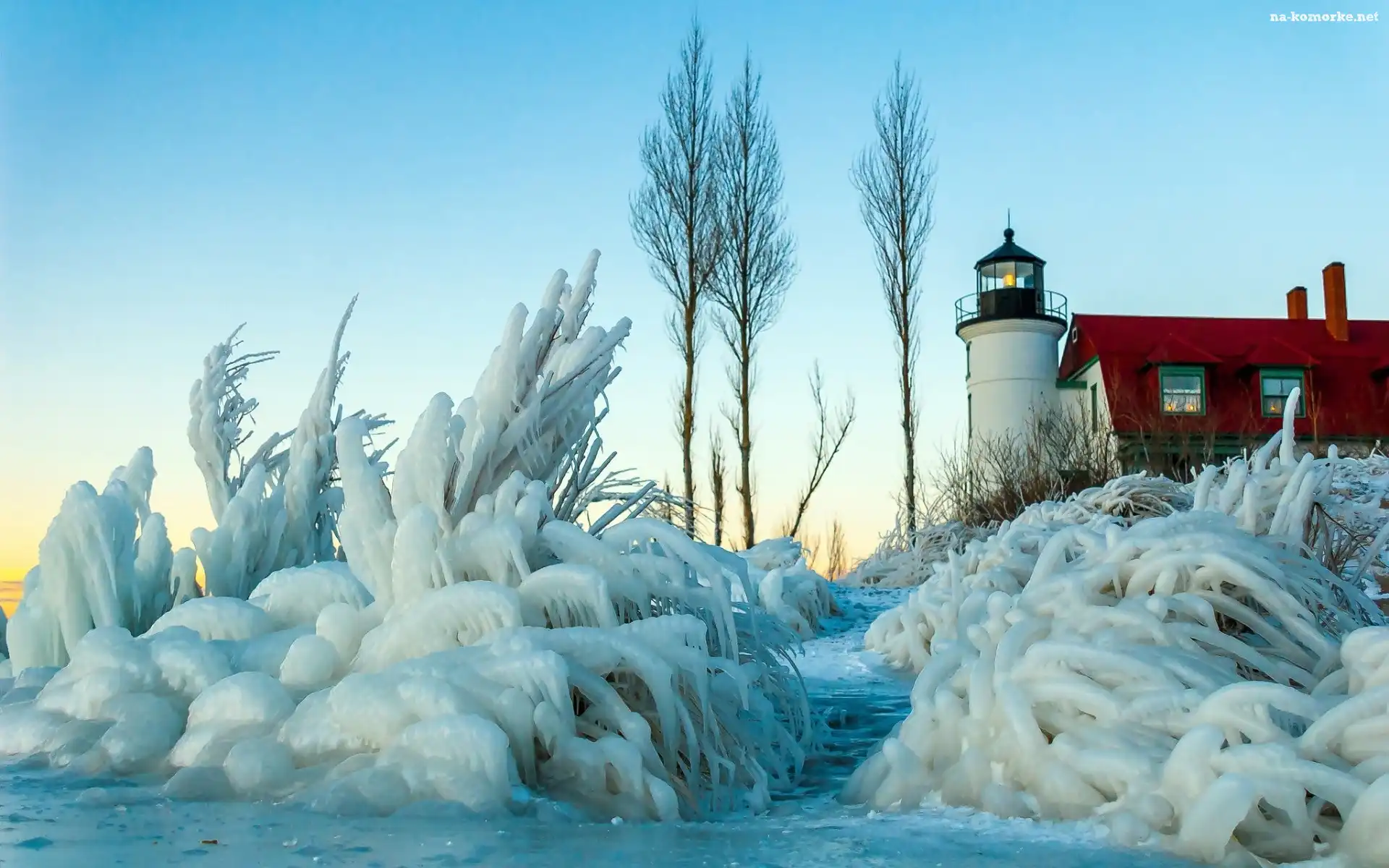 Krzewy, Stan Michigan, Stany Zjednoczone, Zima, Latarnia morska Point Betsie, Drzewa na Komórkę