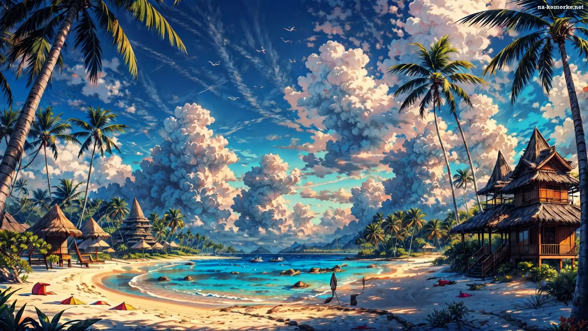 Plaża, Chmury, Niebo, Zatoka, Bungalow, Grafika, Palmy, Morska na Komórkę