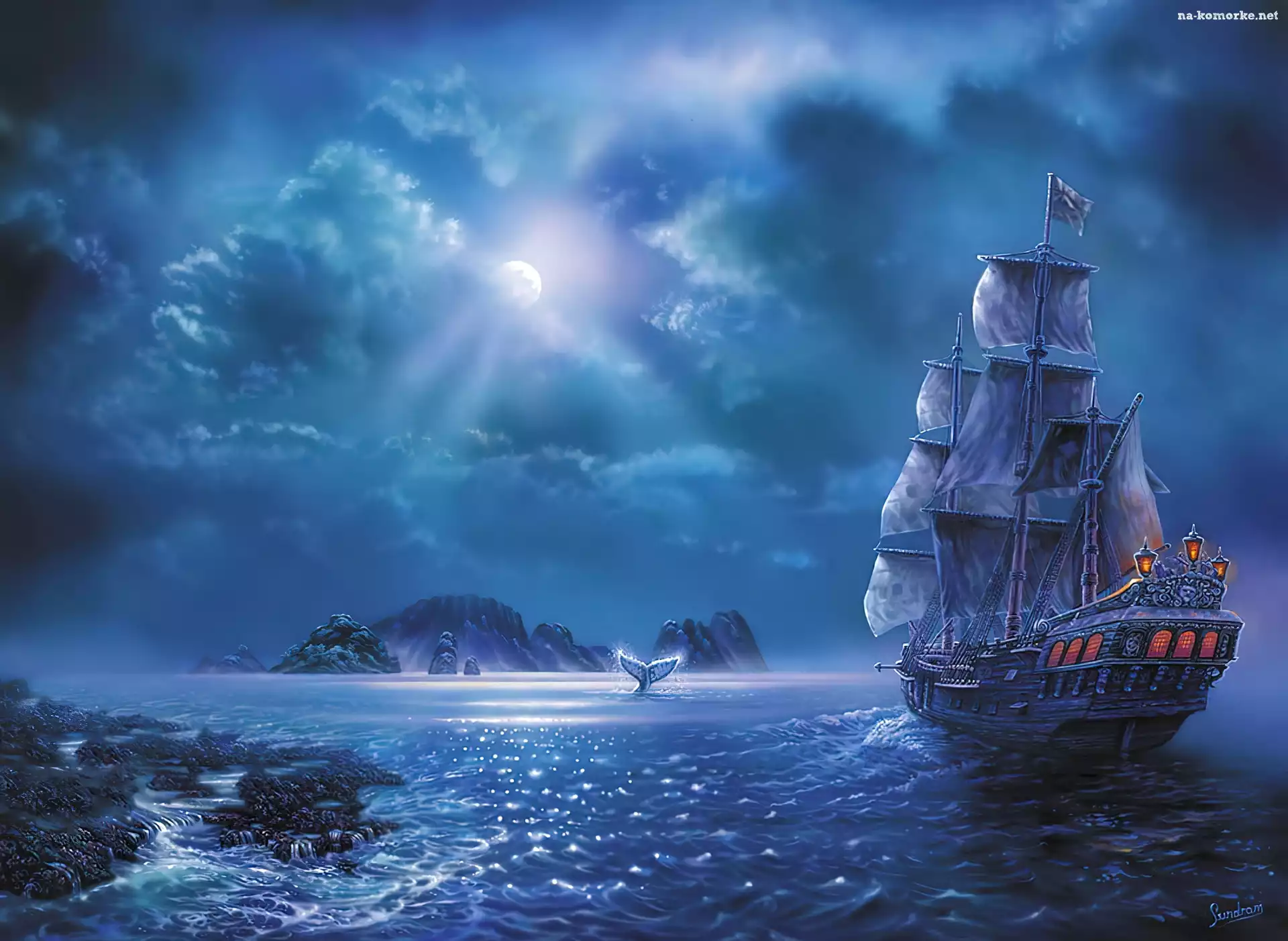 Morze, Księżyca, Żaglowiec, Światło na Komórkę