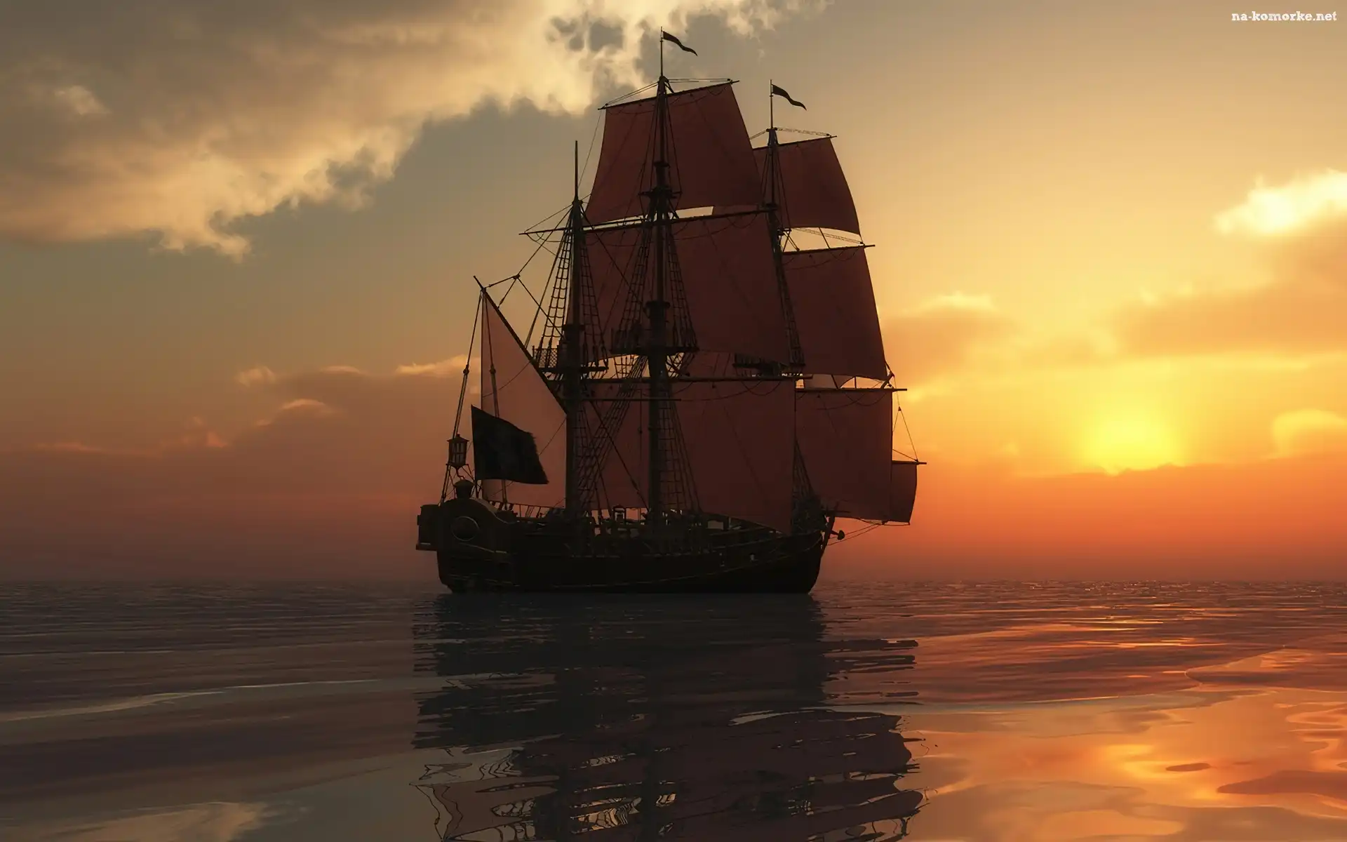 Morze, Słońca, Żaglowiec, Zachód na Komórkę