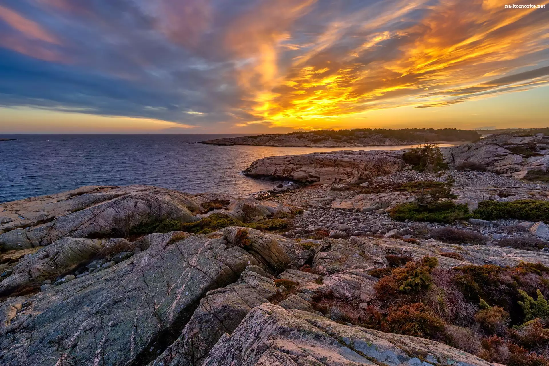 Morze, Zachód słońca, Brzeg, Skały na Komórkę