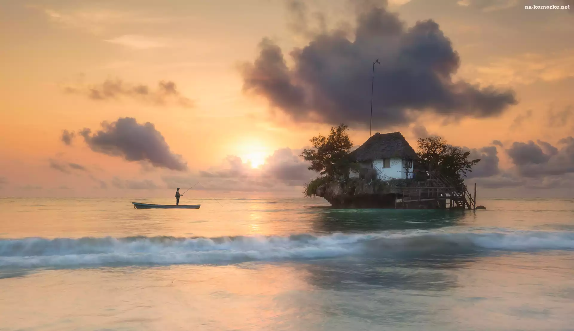 Morze, Łódka, Tanzania, Wędkarz, Miejscowość Michamvi, The Rock Restaurant Zanzibar, Dom, Wschód słońca, Chmury, Restauracja na Komórkę |