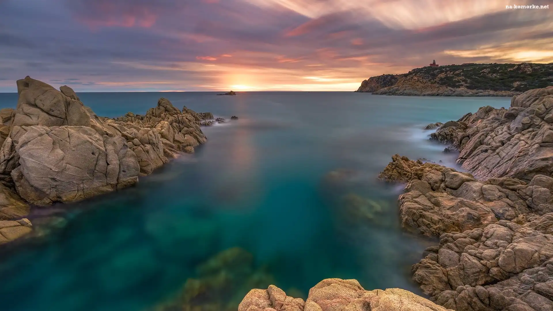 Chmury, Morze, Skały, Latarnia morska, Zachód słońca na Komórkę