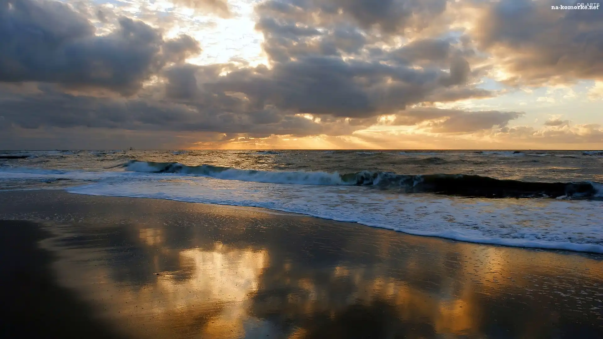 Morze, Zachód Słońca, Chmury, Plaża na Komórkę