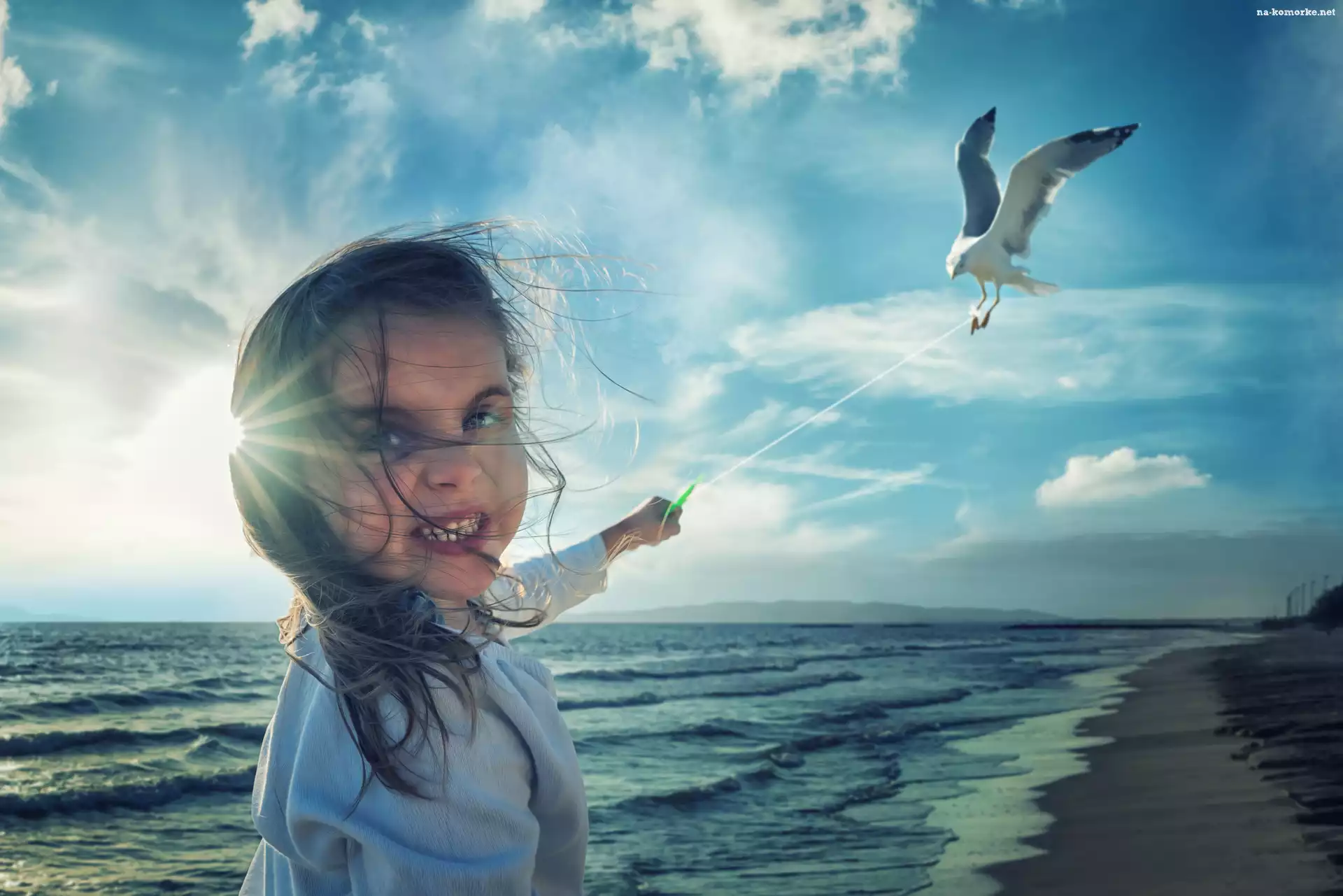 Morze, Sznurek, Dziewczynka, Mewa na Komórkę