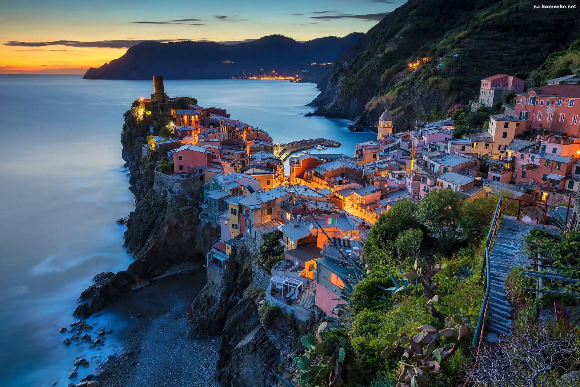 Włochy, Morze, Noc, Cinque Terre, Vernazza, Domy, Góry na Komórkę