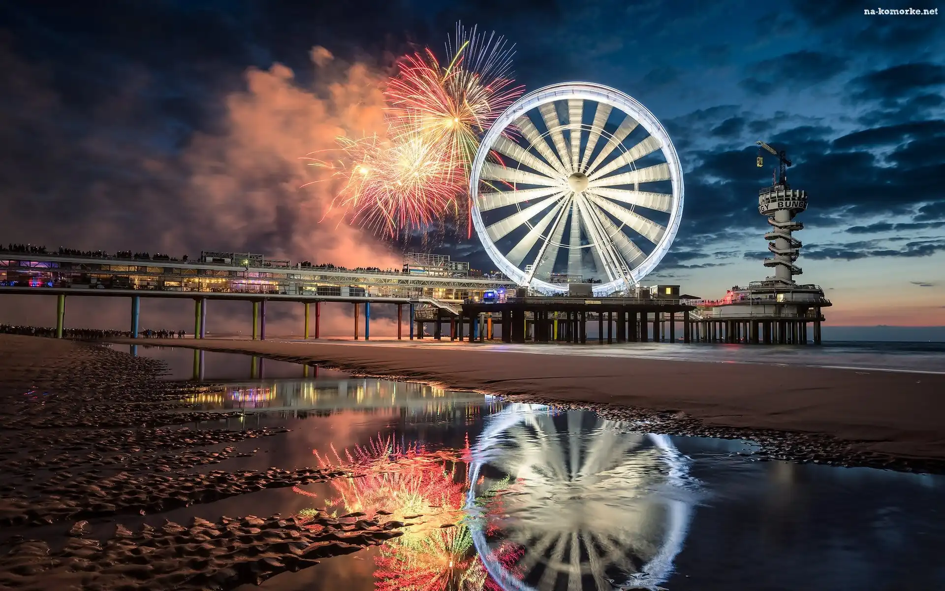 Holandia, Plaża, Fajerwerki, Scheveningen, Sylwester, Morze Północne, Haga, Molo, Koło, Diabelski młyn na Komórkę |