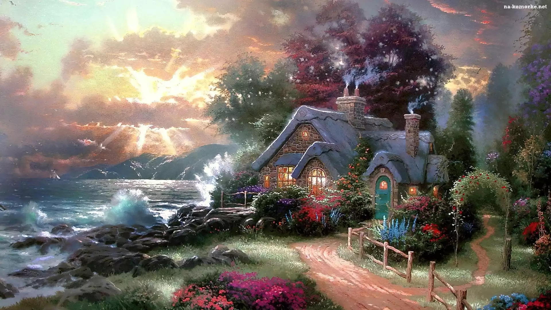 Morze, Domek, Zieleń, Kwiaty, Drzewa na Komórkę