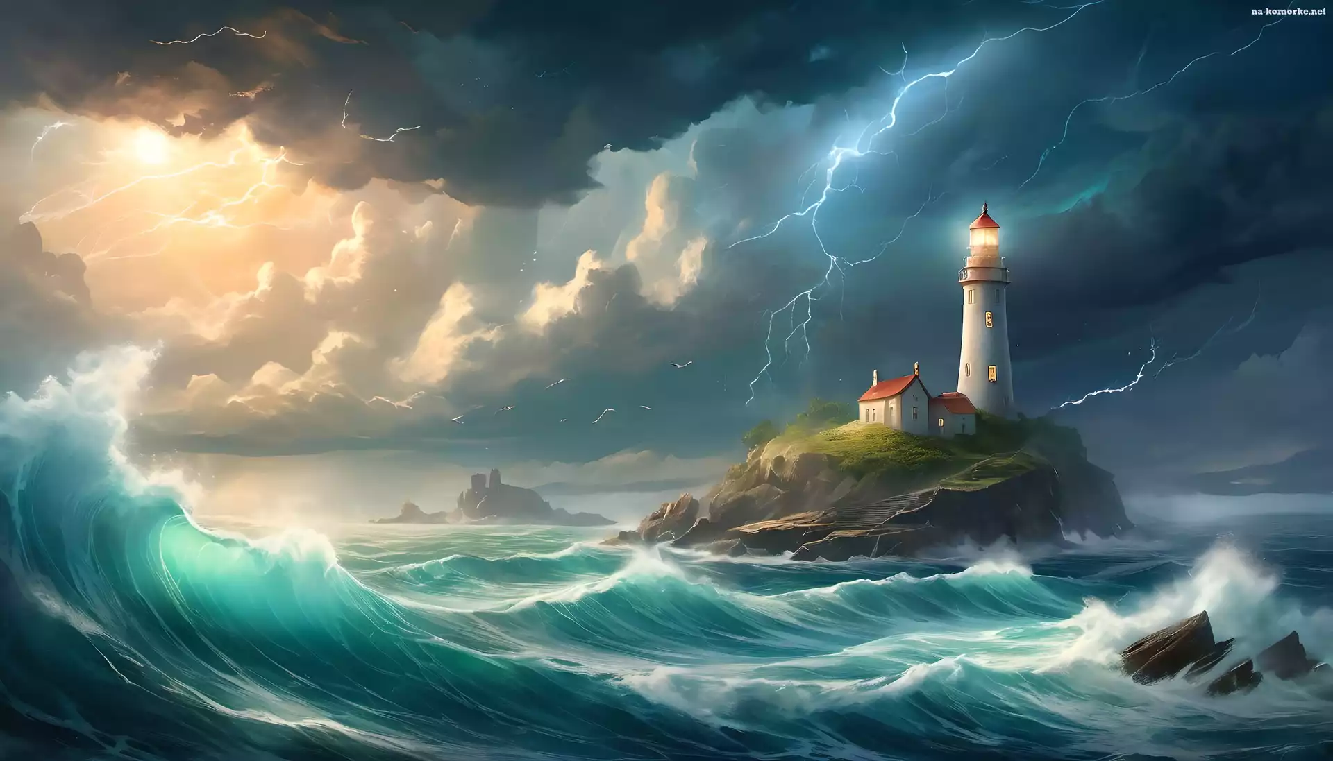 Pioruny, Sztorm, Latarnia morska, Grafika, Fale, Burza, Morze na Komórkę