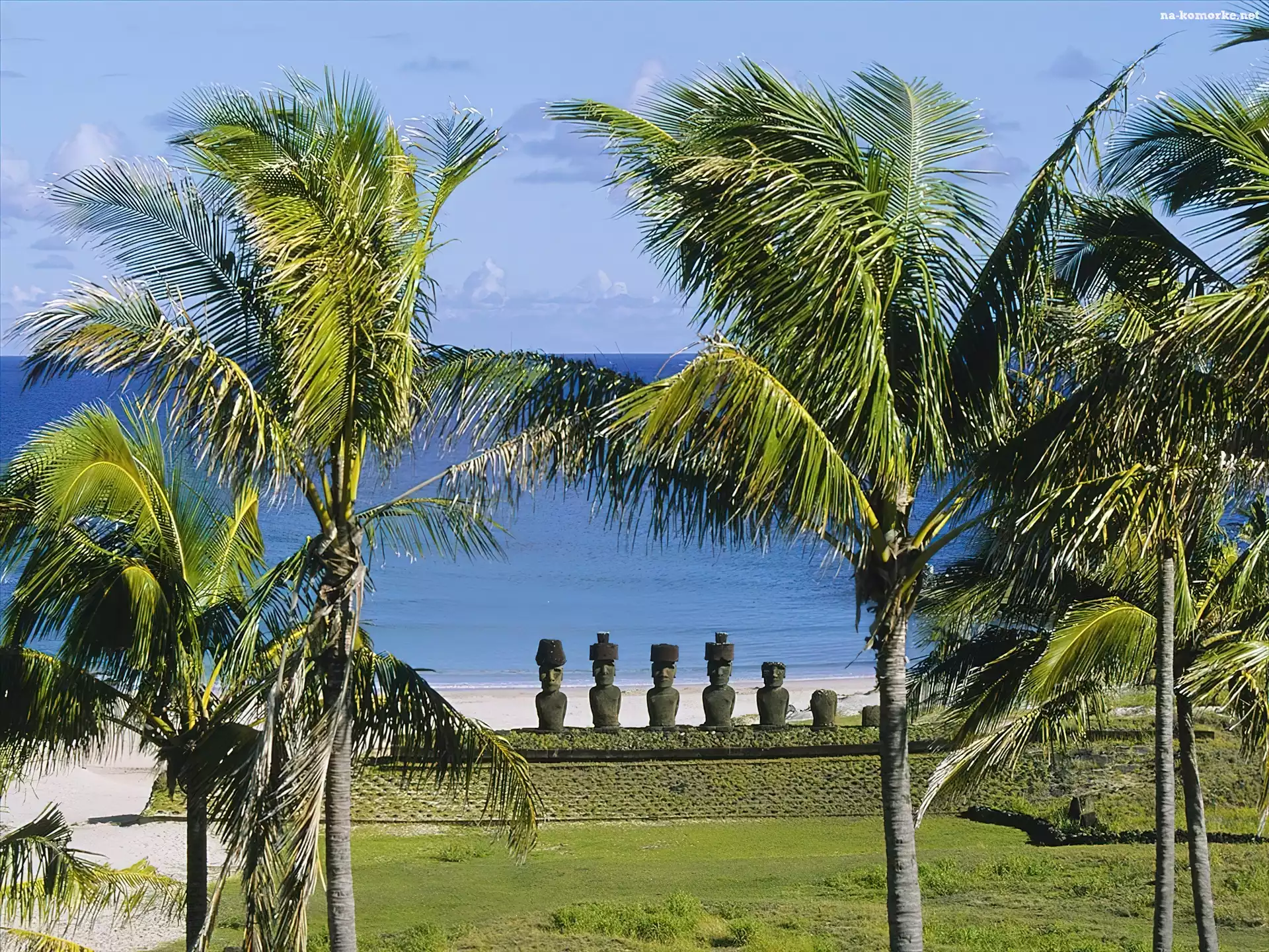 Morze, Chile, Wyspa Wielkanocna, Palmy, Trawa na Komórkę