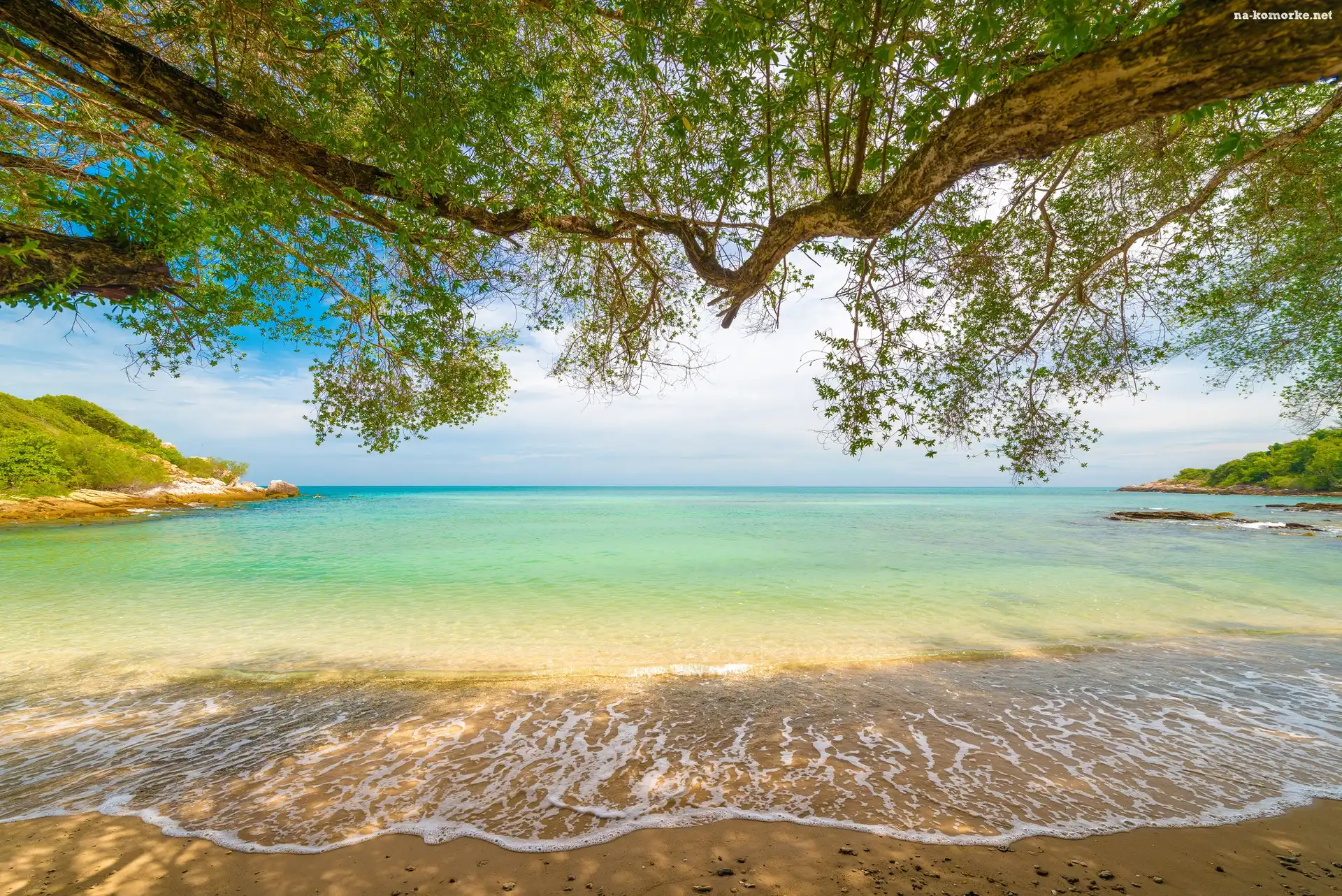 Morze, Drzewa, Plaża, Piasek na Komórkę
