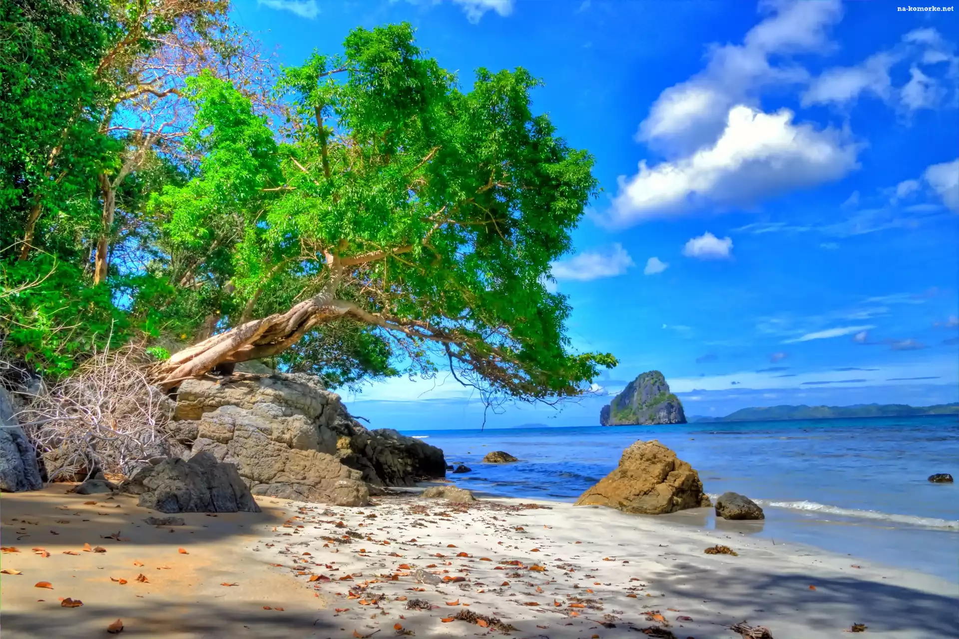 Morze, Drzewo, Plaża, Skały na Komórkę